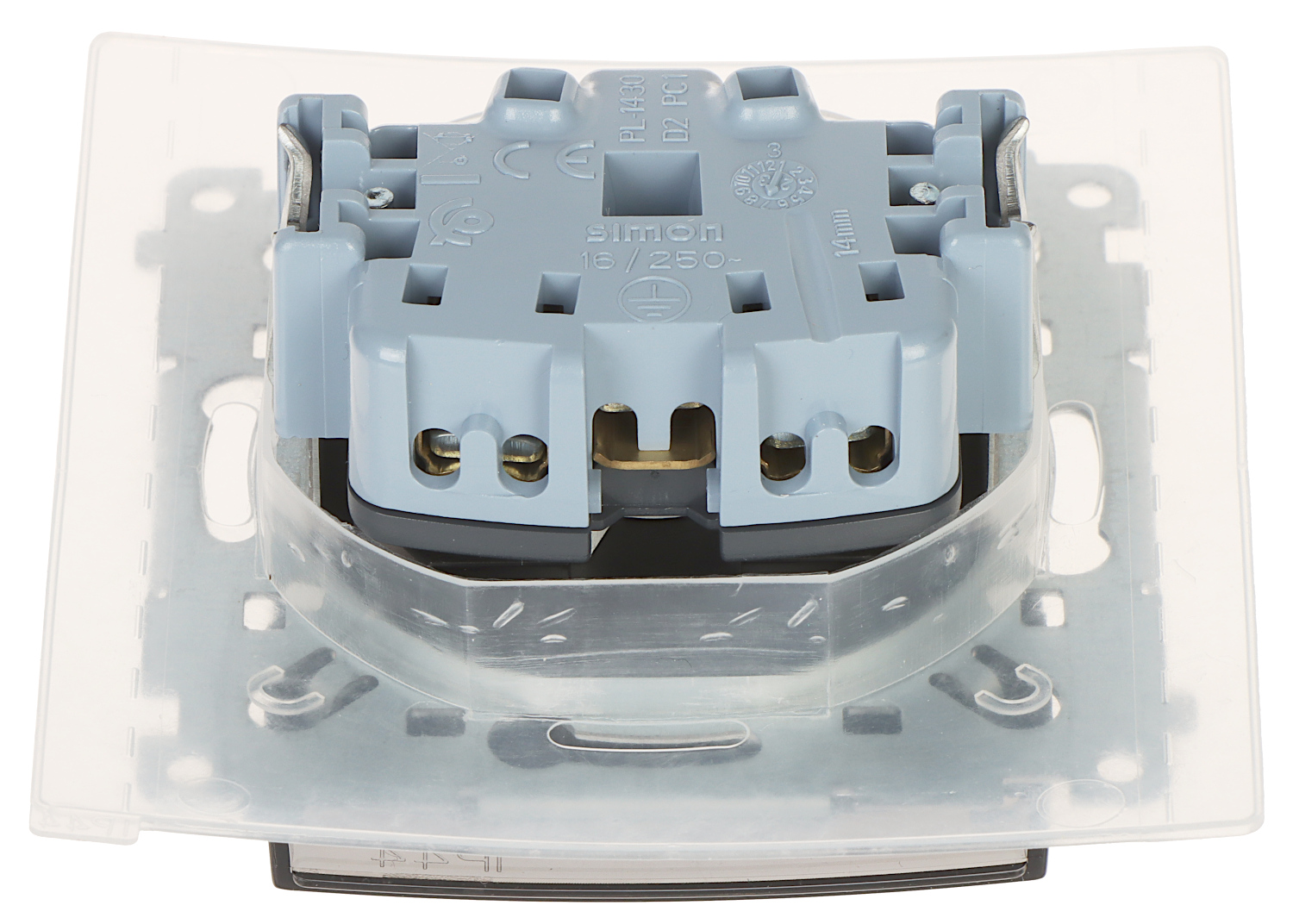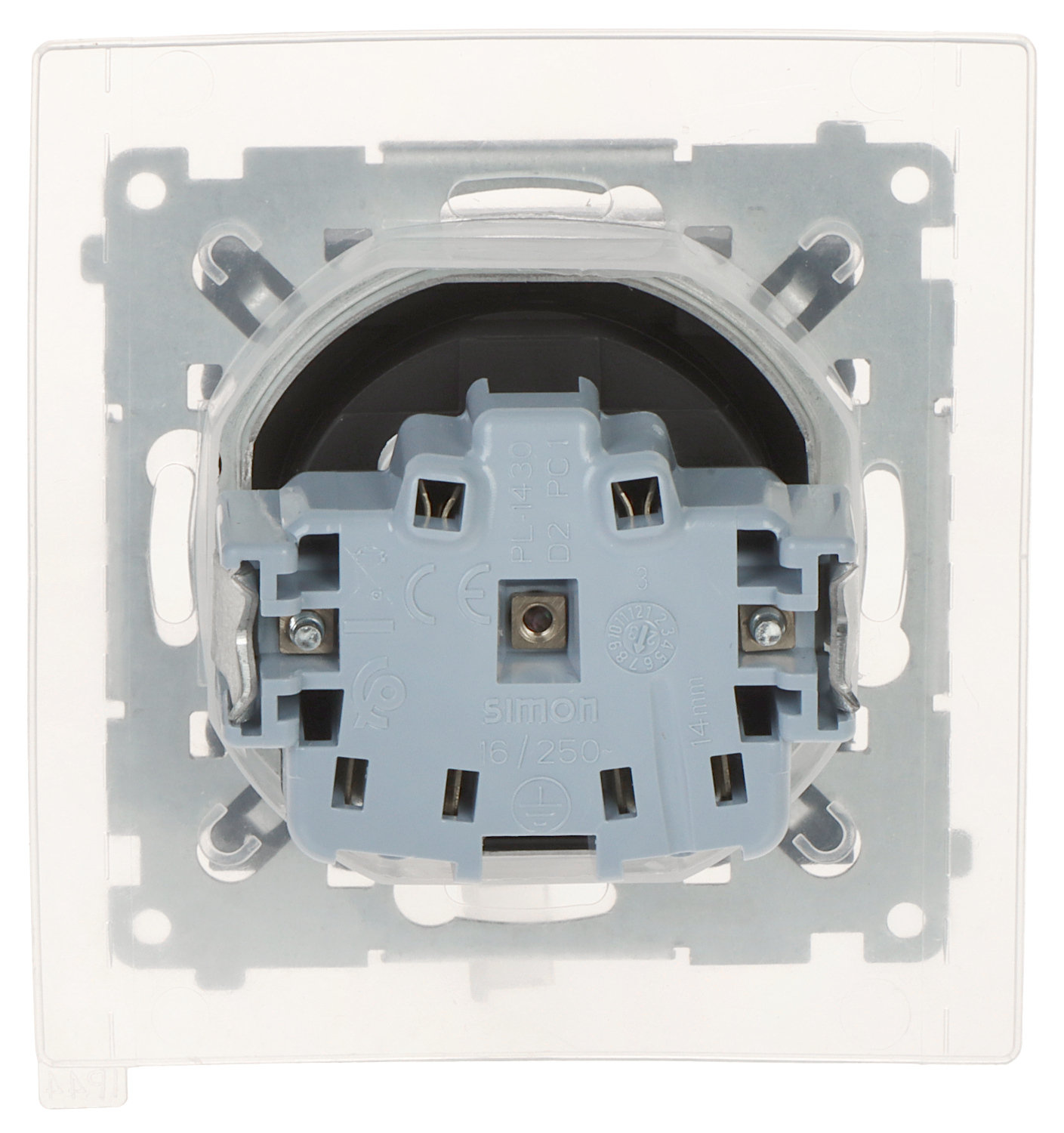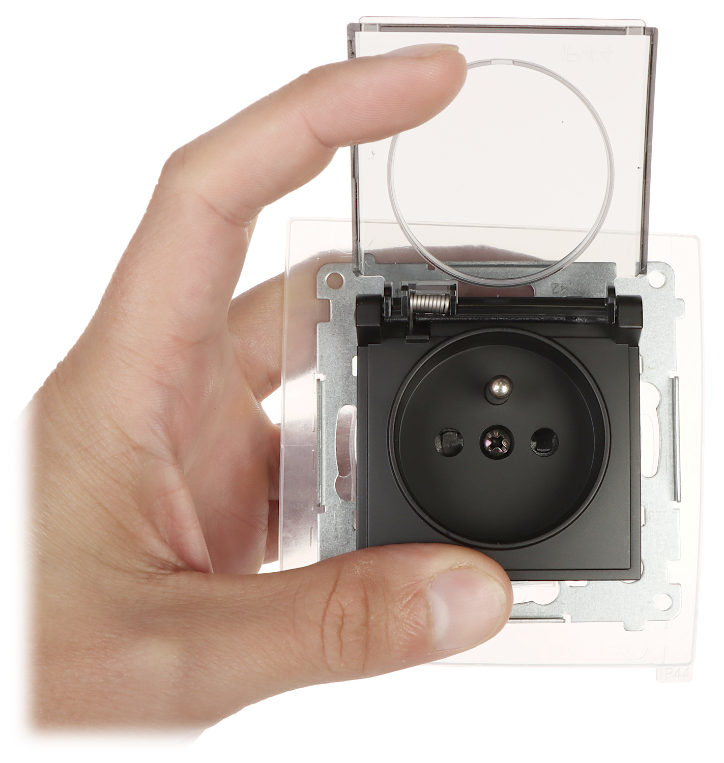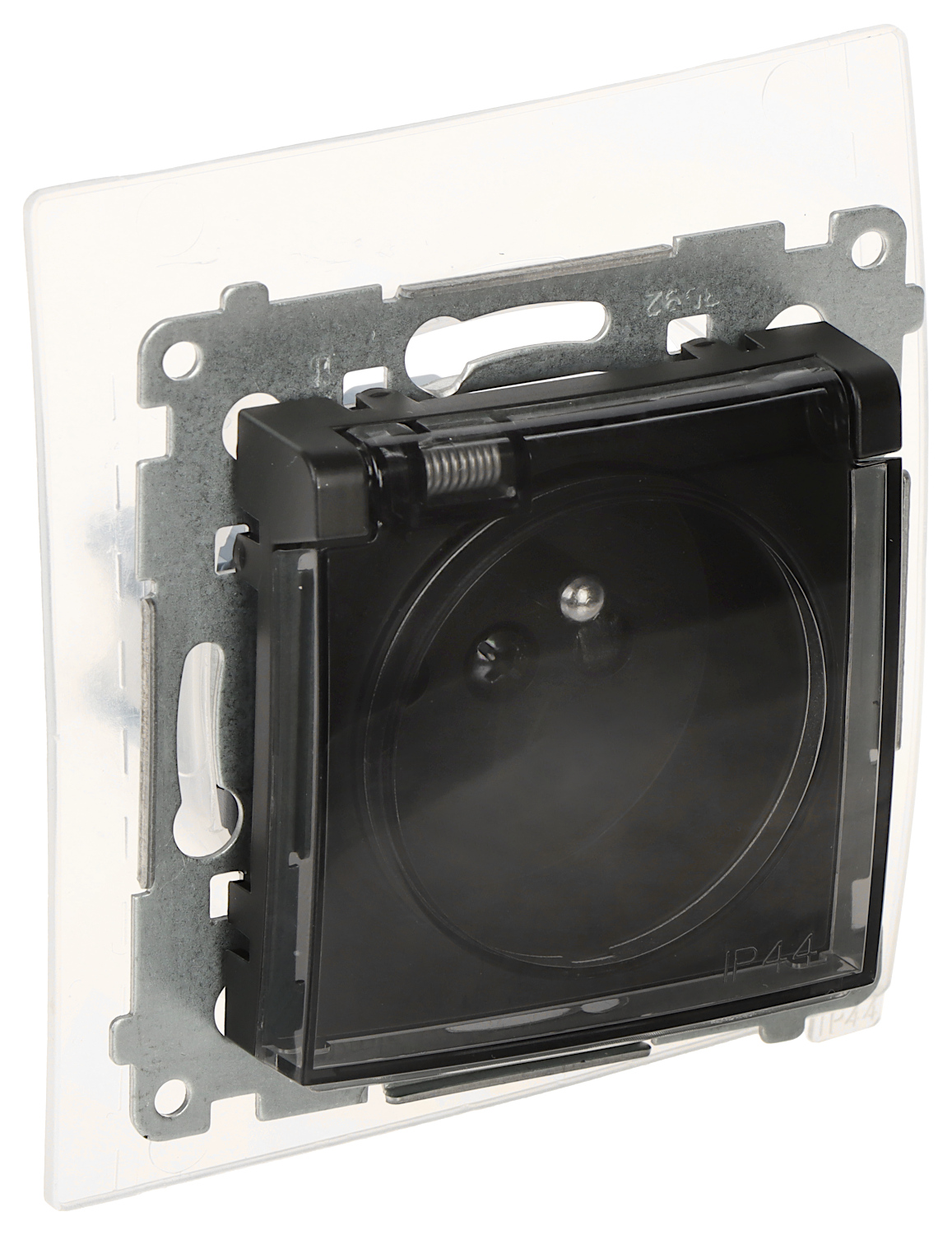 Rated voltage: 250 V AC ; Maximal current load: 16 A ; Grounding; Cable terminals: screw terminals ; Socket type: CEE 7/5 ; "Index of Protection": IP44 ; Color: Matt black (cover), Transparent (flap) ;