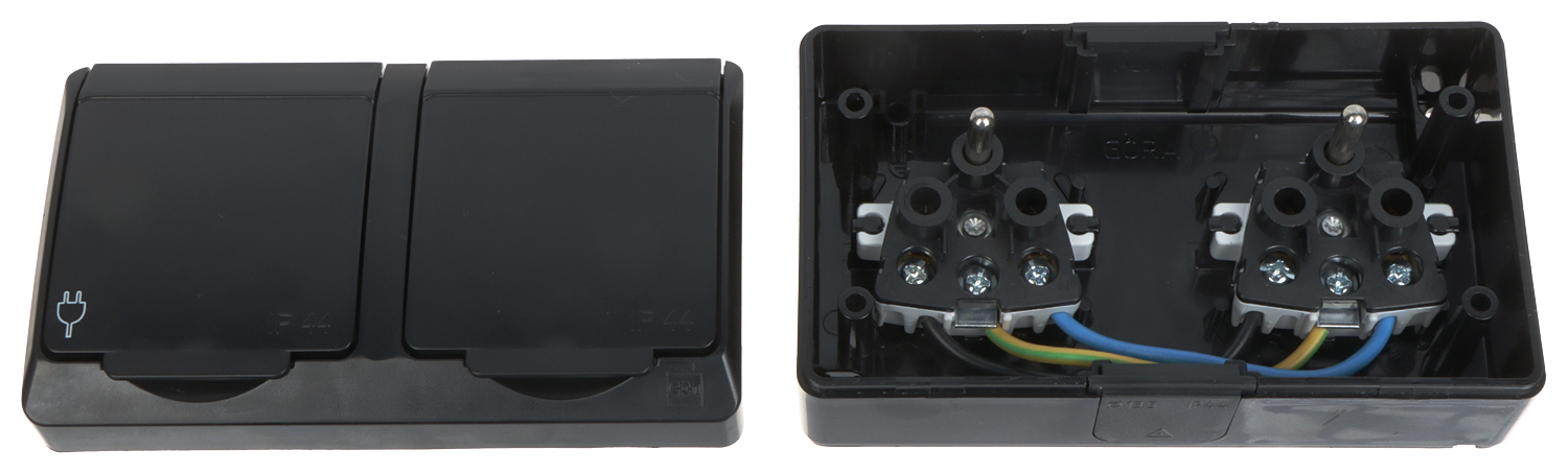 Rated voltage: 250 V AC ; Maximal current load: 16 A ; Grounding; Cable terminals: screw terminals ; Socket type: 2 x CEE 7/5 ; "Index of Protection": IP44 ; Color: Black ;
