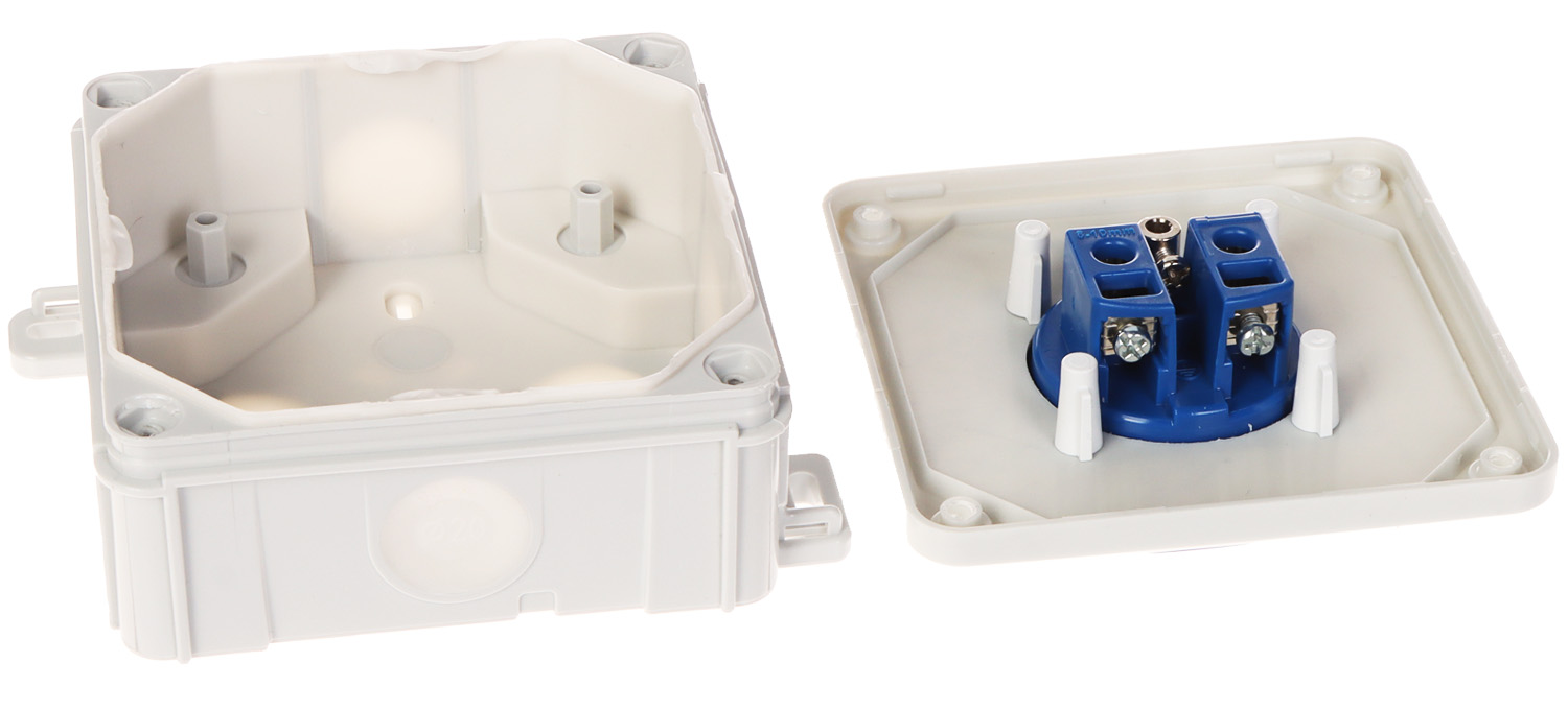 Number of intakes: 4  pcs Ø 20 mm ; Rated voltage: 250 V AC ; Maximal current load: 16 A ; Grounding; Cable terminals: screw terminals ; Socket type: CEE 7/5 ; Protection shutter; "Index of Protection": IP54 ;