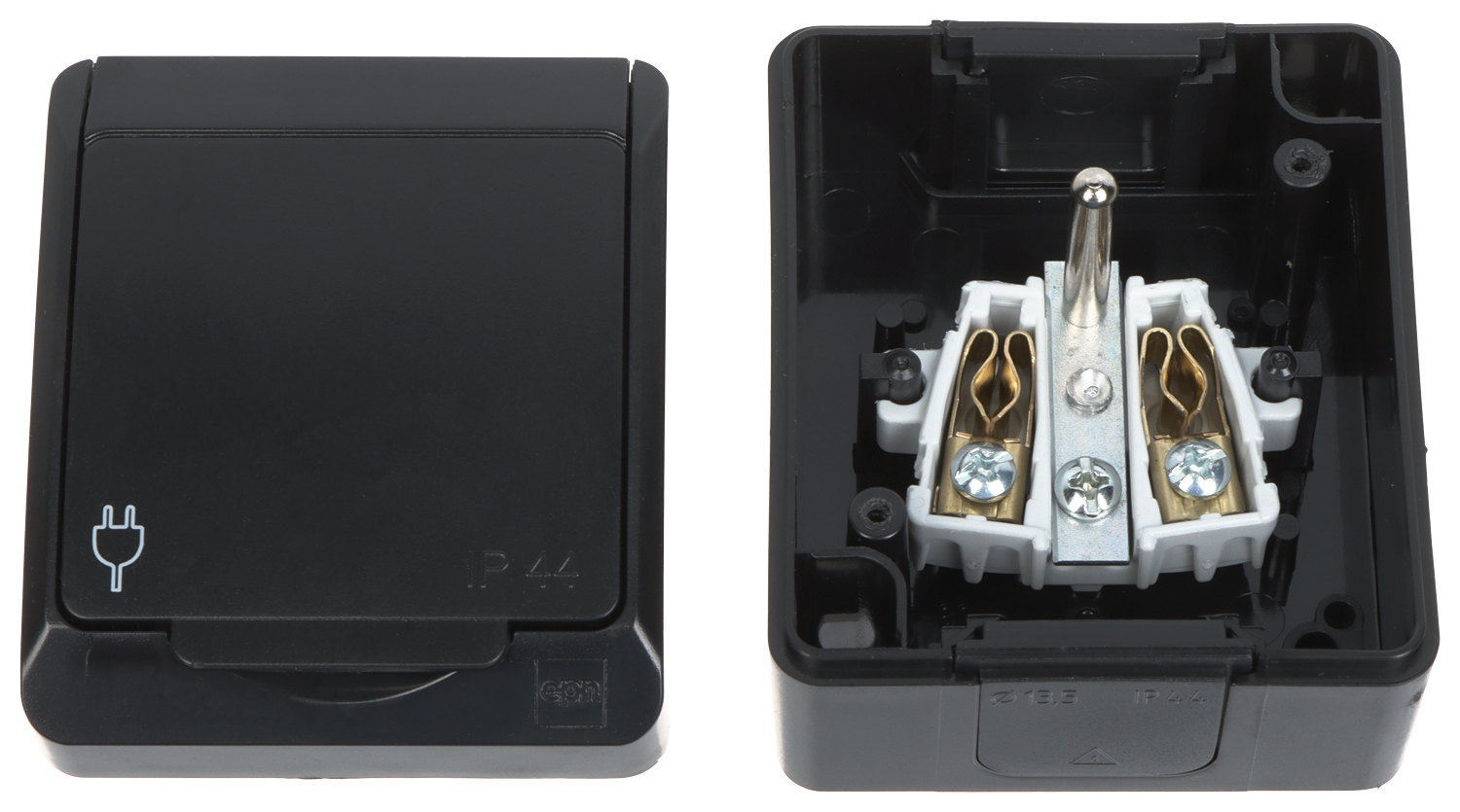Rated voltage: 250 V AC ; Maximal current load: 16 A ; Grounding; Cable terminals: screw terminals ; Socket type: CEE 7/5 ; "Index of Protection": IP44 ; Color: Black ;