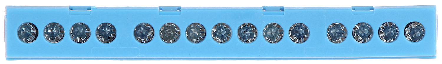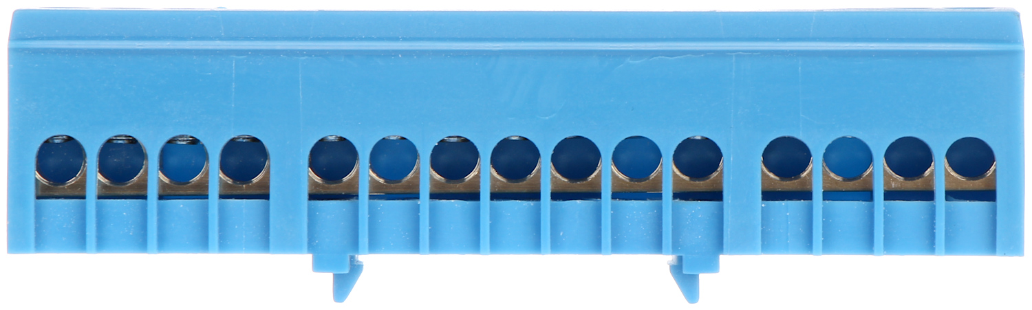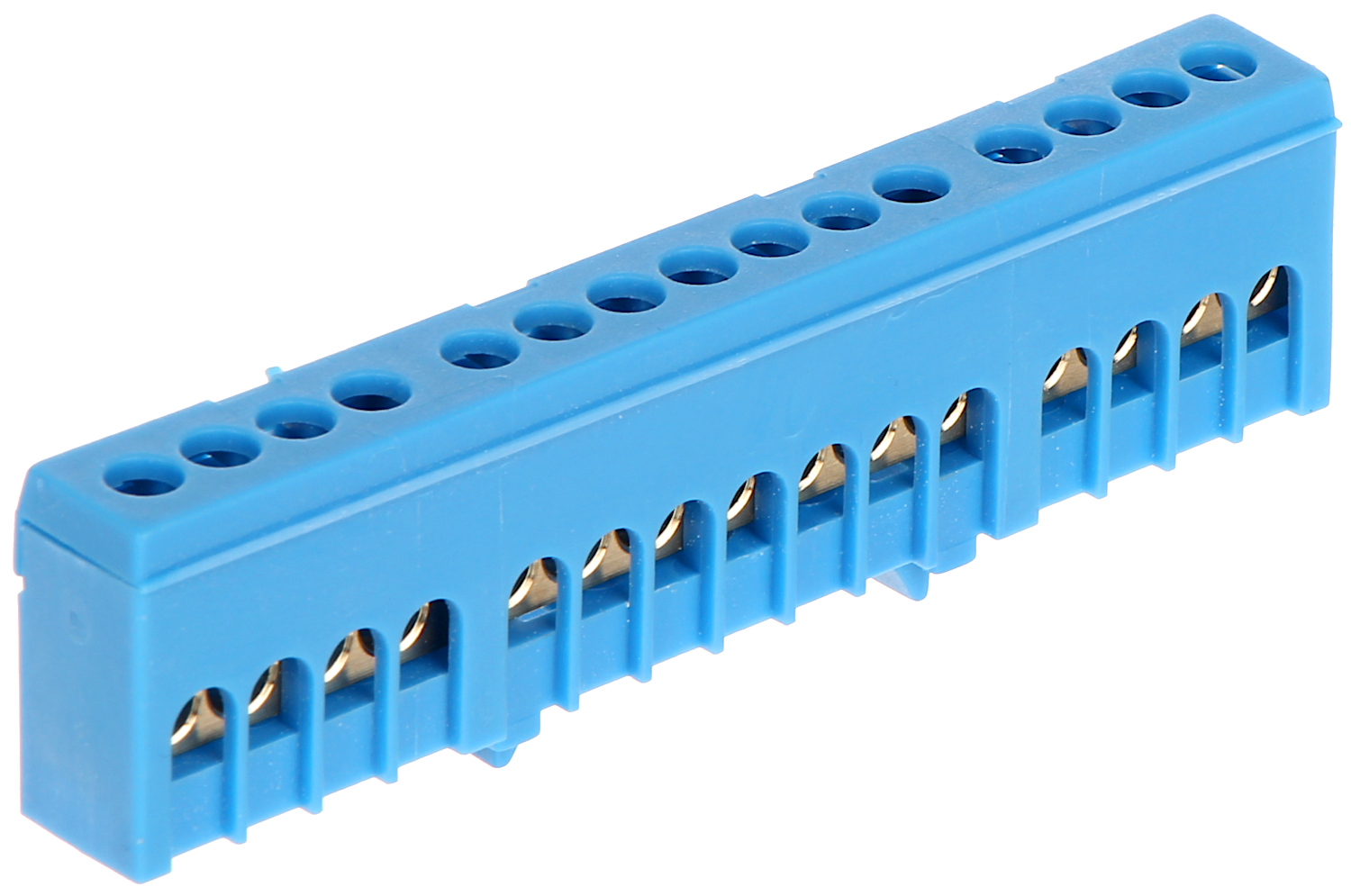 Insulated distribution terminal block for using with modular distribution cabinets ; Rated current: 63 A ; Rated voltage: 690 V ; Number of terminals: 15 x 16 mm² Ø 5 mm (screw terminals) ; Color: Blue ; Dimensions: 107 x 13 x 31 mm ;