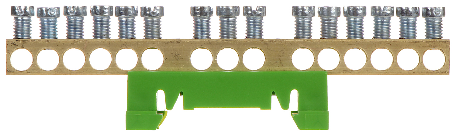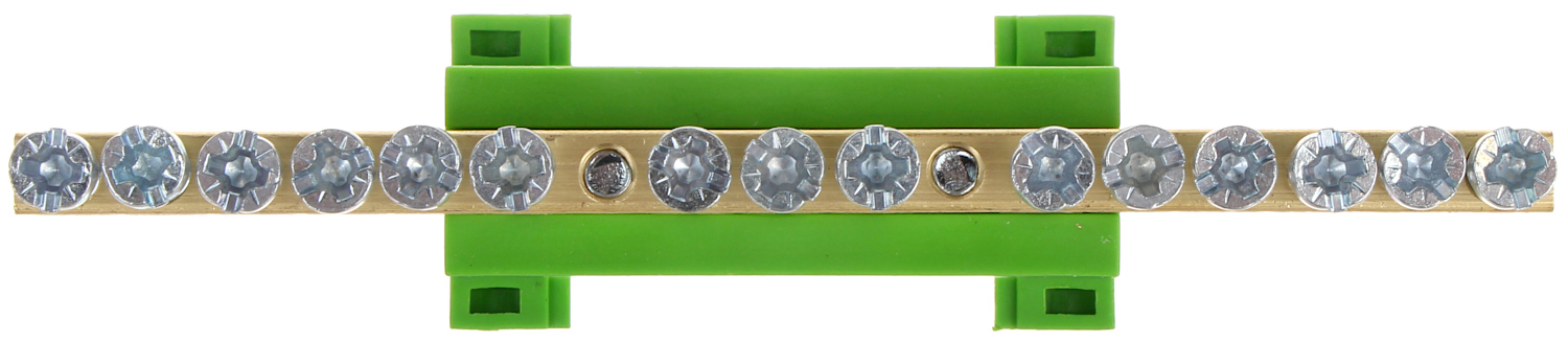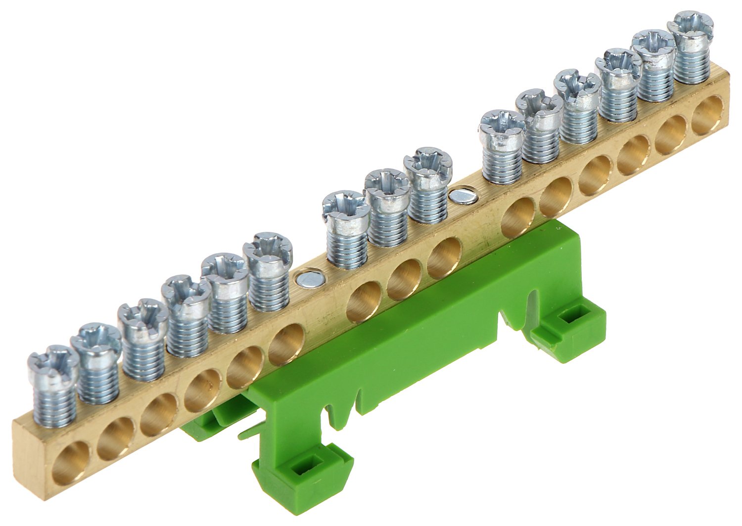 Distribution terminal block for using with modular distribution cabinets ; Rated current: 63 A ; Rated voltage: 690 V ; Number of terminals: 15 x 16 mm² Ø 5 mm (screw terminals) ; Color: Green ; Dimensions: 111 x 23 x 31 mm ;