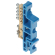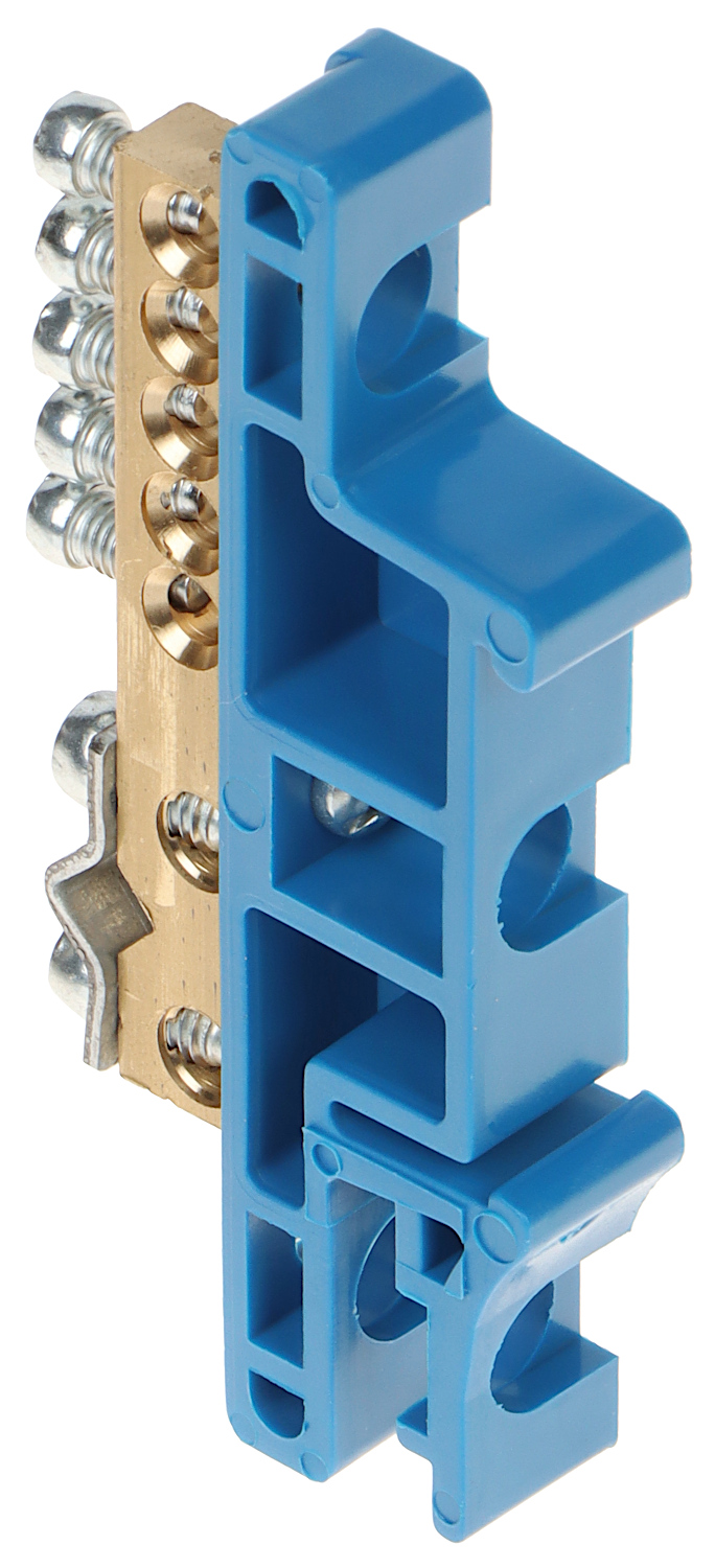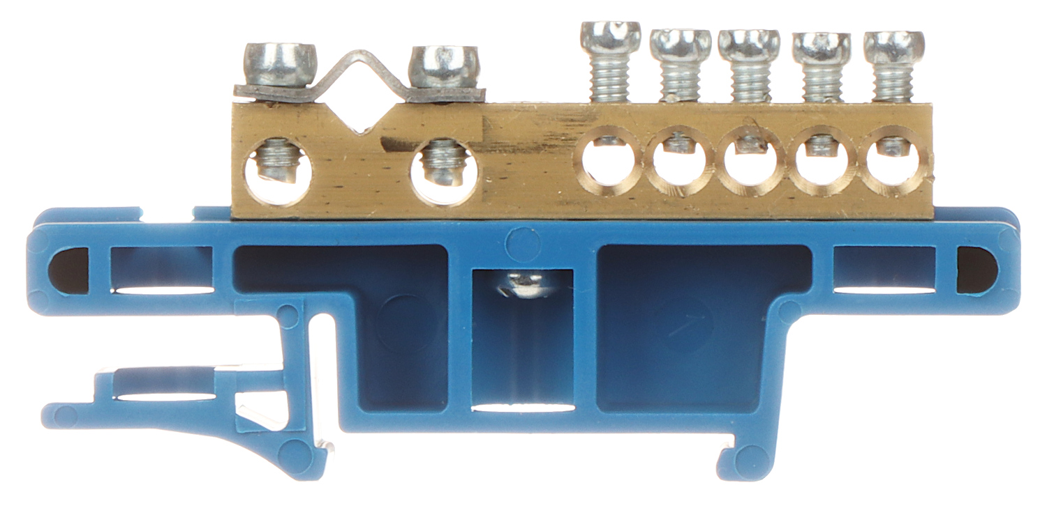 Distribution terminal block for using with modular distribution cabinets ; Number of terminals: 5 Ø 4 mm (screw terminals) + 2 Ø 5 mm (screw terminals) ; Color: Blue ; Dimensions: 84 x 12 x 38 mm ;