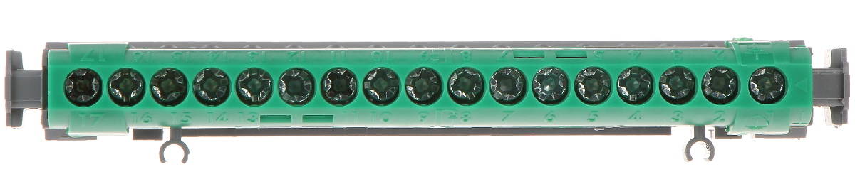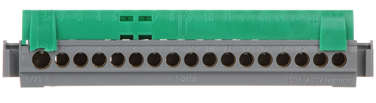 Insulated distribution terminal block for using with modular distribution cabinets Nedbox, RWN, Practibox3, XL3 125, RN 65; Maximum permissible current: 100 A - 400 V AC @ 25 mm², 80 A - 400 V AC @ 16 mm² ; Number of terminals: 1 x 6 ... 25 mm² (screw terminal), 16 x 1.5 ... 16 mm² (screw terminals) ; Color: Green ; Dimensions: 141 x 30 x 20 mm ;