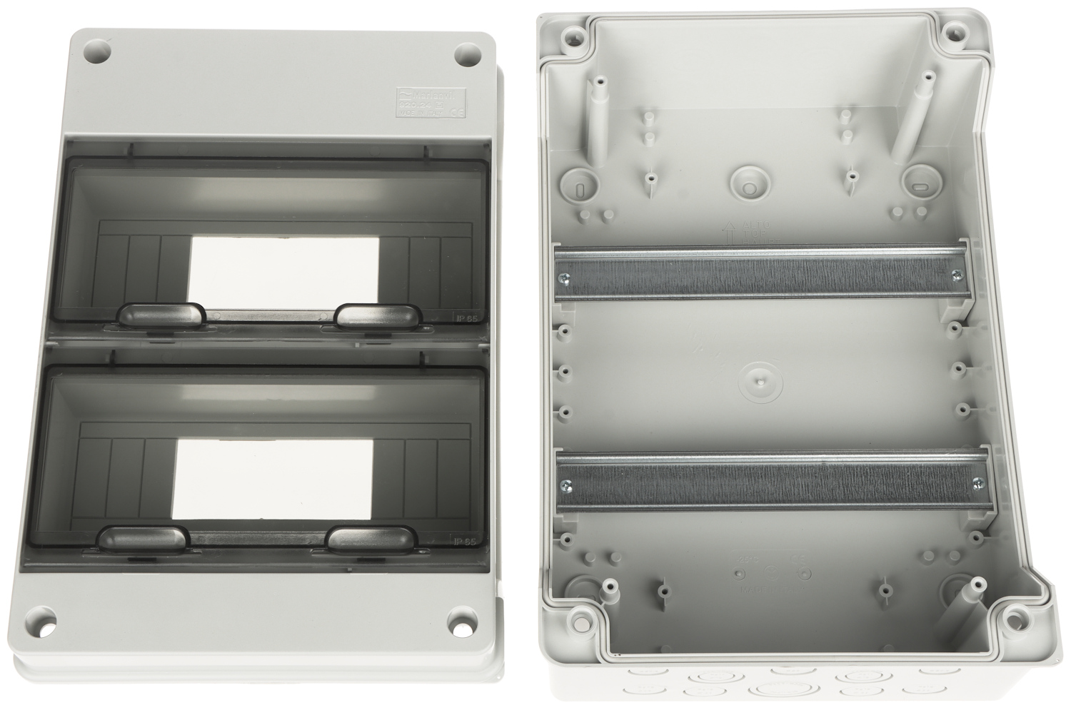 Number of mounted modules: 6 ... 12 x 2 rows ; Transparent door; "Index of Protection": IP65 ; Dimensions: 375 x 250 x 145 mm ;