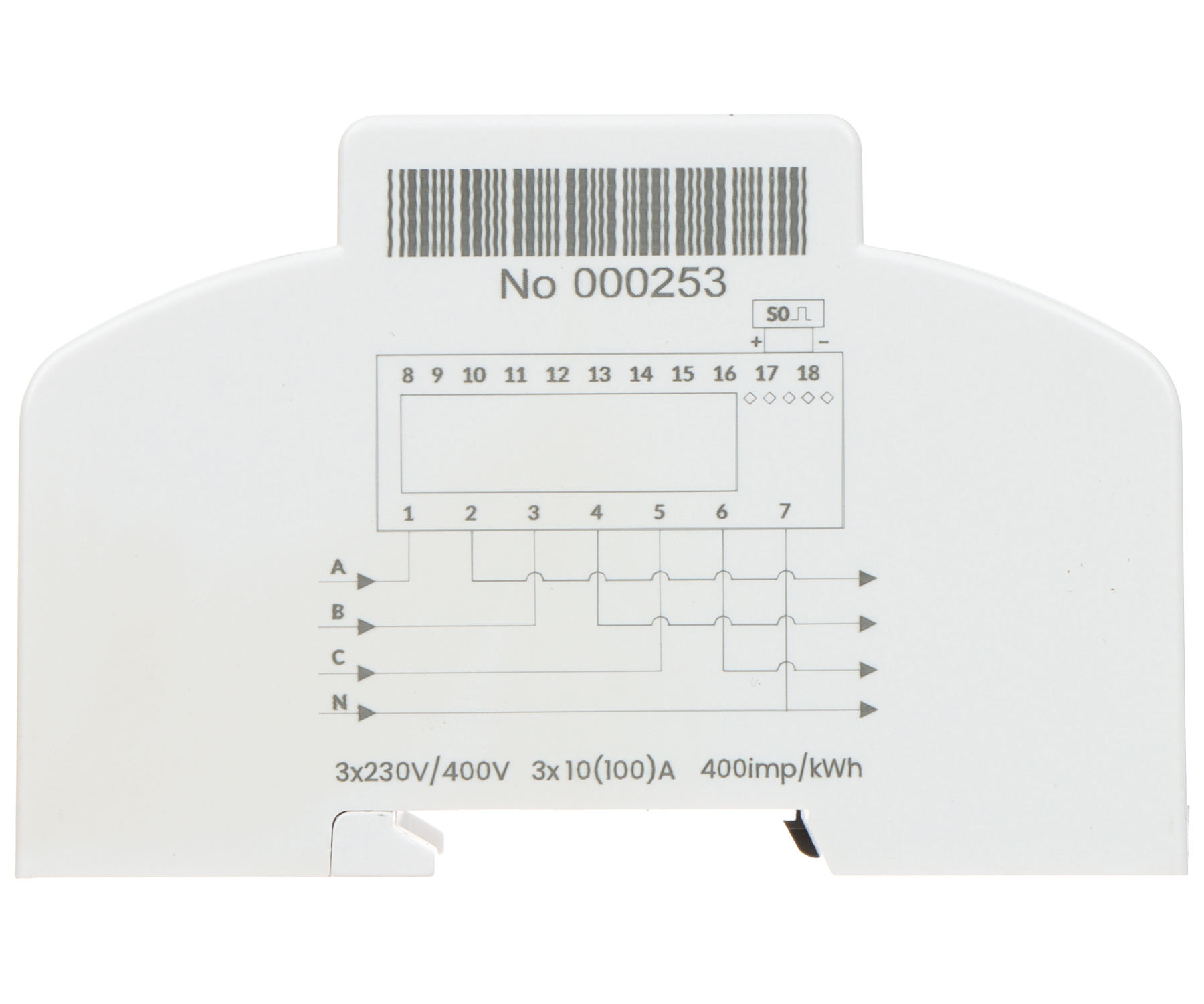 Device type: Electric Energy Meter, Three-phase, Analog ; Rated voltage: 3 x 230 (400) V AC, 50 Hz ; Measurement unit: kWh ; LCD display: 5+1 digits ; Measuring accuracy: Class B ; Impulse frequency: 400 imp/kWh ; Connectors type: screw terminals ; Main features: Pulse output : S0-type, 400 imp/kWh ; Housing: DIN, TS-35 rail mounting ;