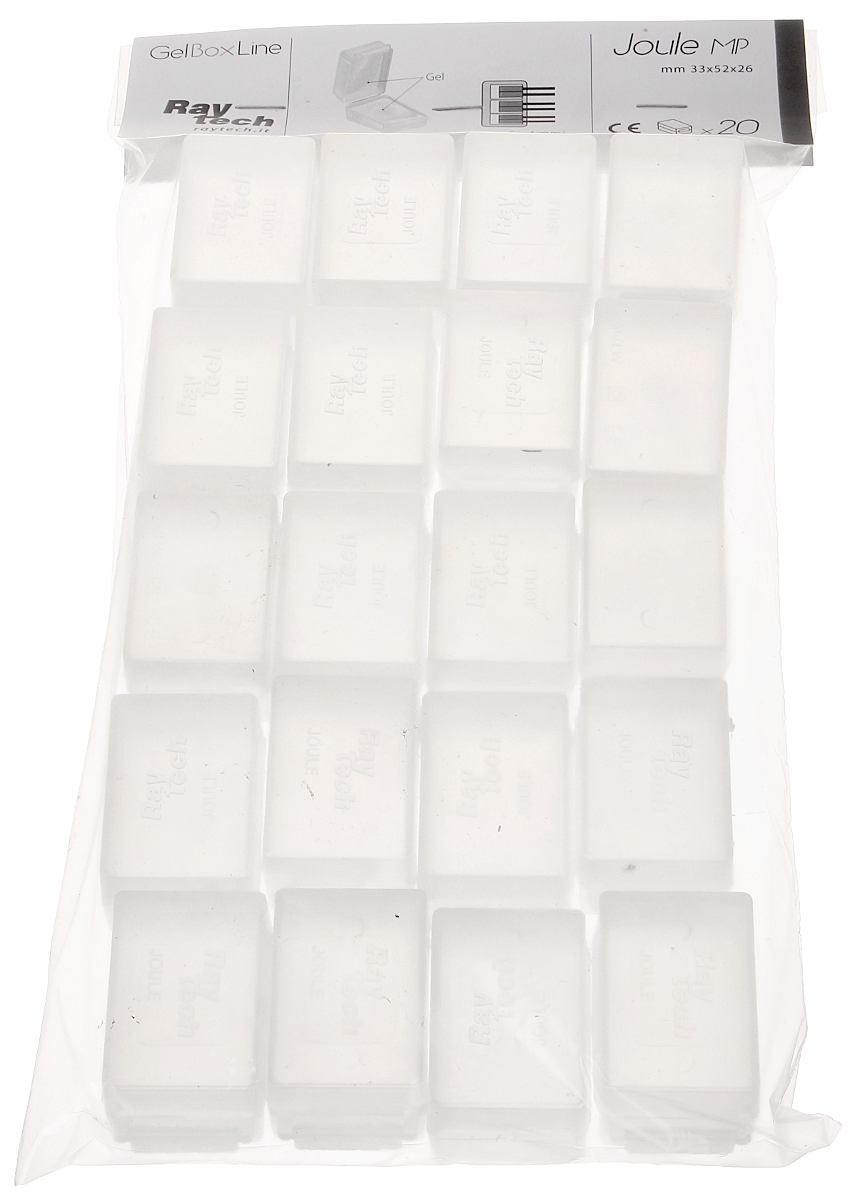 Universal mounting box filled with gel, allowing the connection of electrical, telephone, signal, antenna cables, etc. according to IP68 Protection Class; In package: 20 pcs The price for package ; Voltage insulation: 1 kV ; "Index of Protection": IP68 ; Internal dimensions: 33 x 52 x 26 mm ;