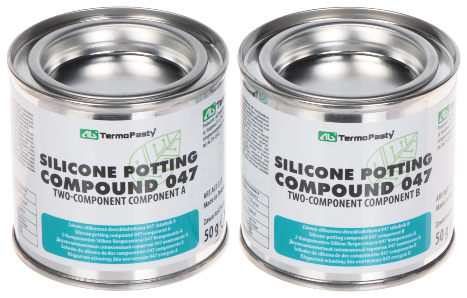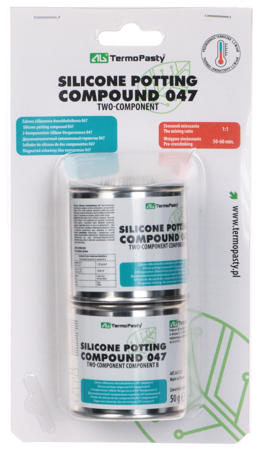 The COMPOUND-047/100 two-component rubber is intended to protect electronic circuits and electrical connections against external factors; Voltage insulation: 14.4 kV / mm ; Package capacity: 2 x 50 g ; Thermal conductivity: 1.4 W/(m·K) ; Operation temp: -50 °C ... 180 °C ;