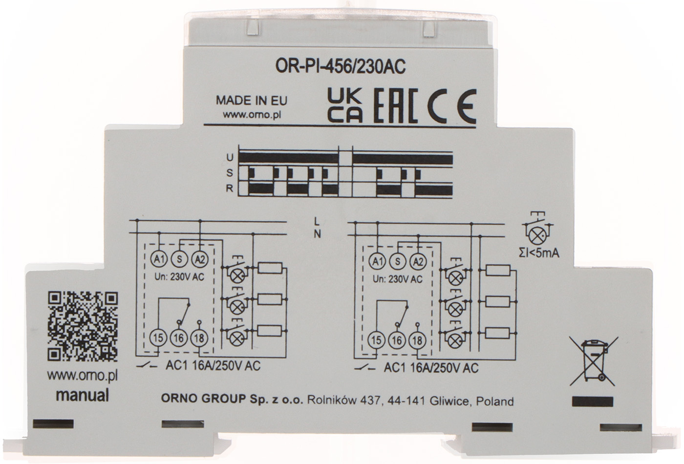 It can be used to increase maximal load of controller transistor output line and for galvanic isolation between output line and load point; Number of relay outputs: ; Power supply: 230 V AC ; Relay maximal load: 16 A / 250 V AC ; Output: 1 x NO/NC ; Manufacturer / Brand: ORNO ;
