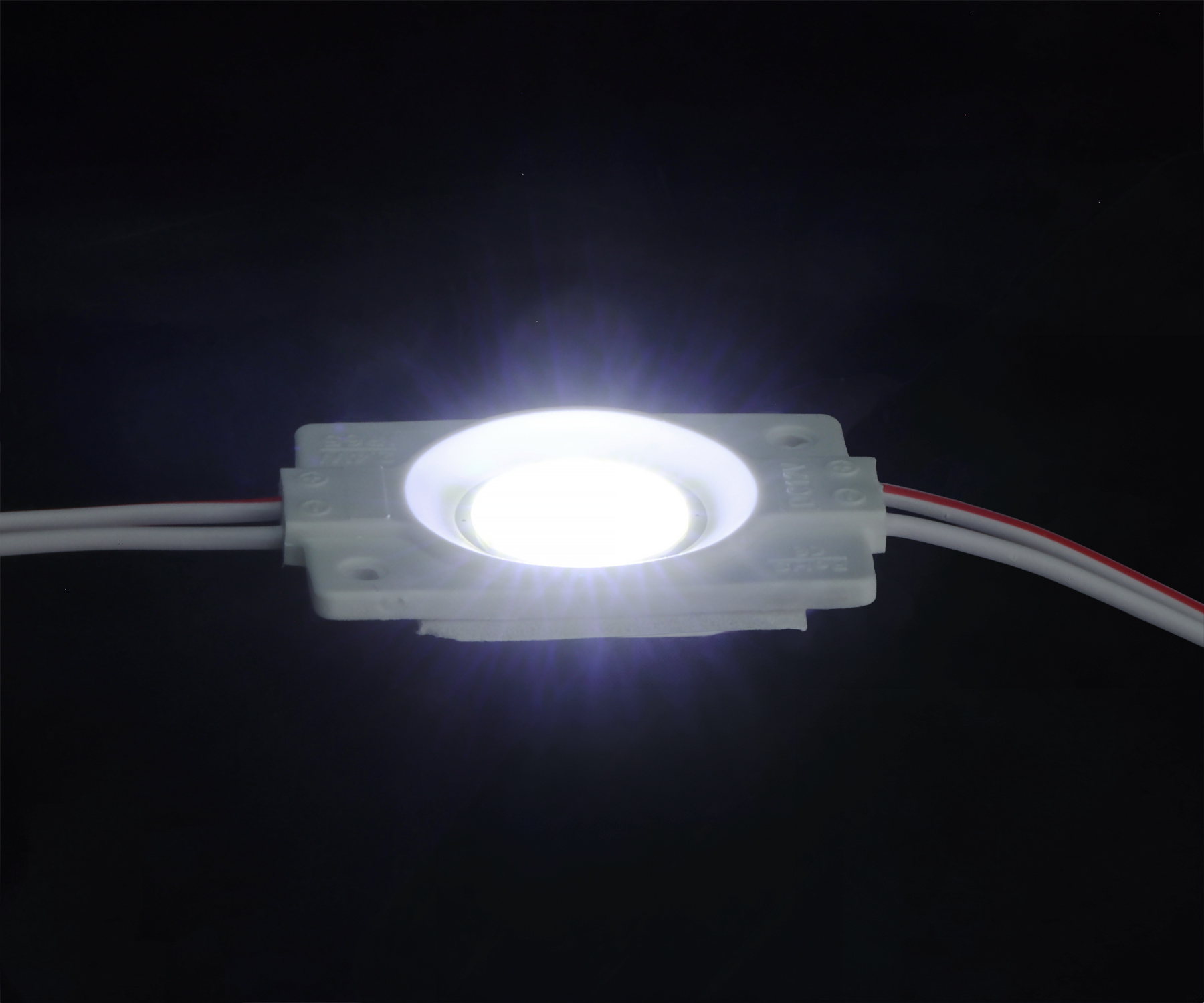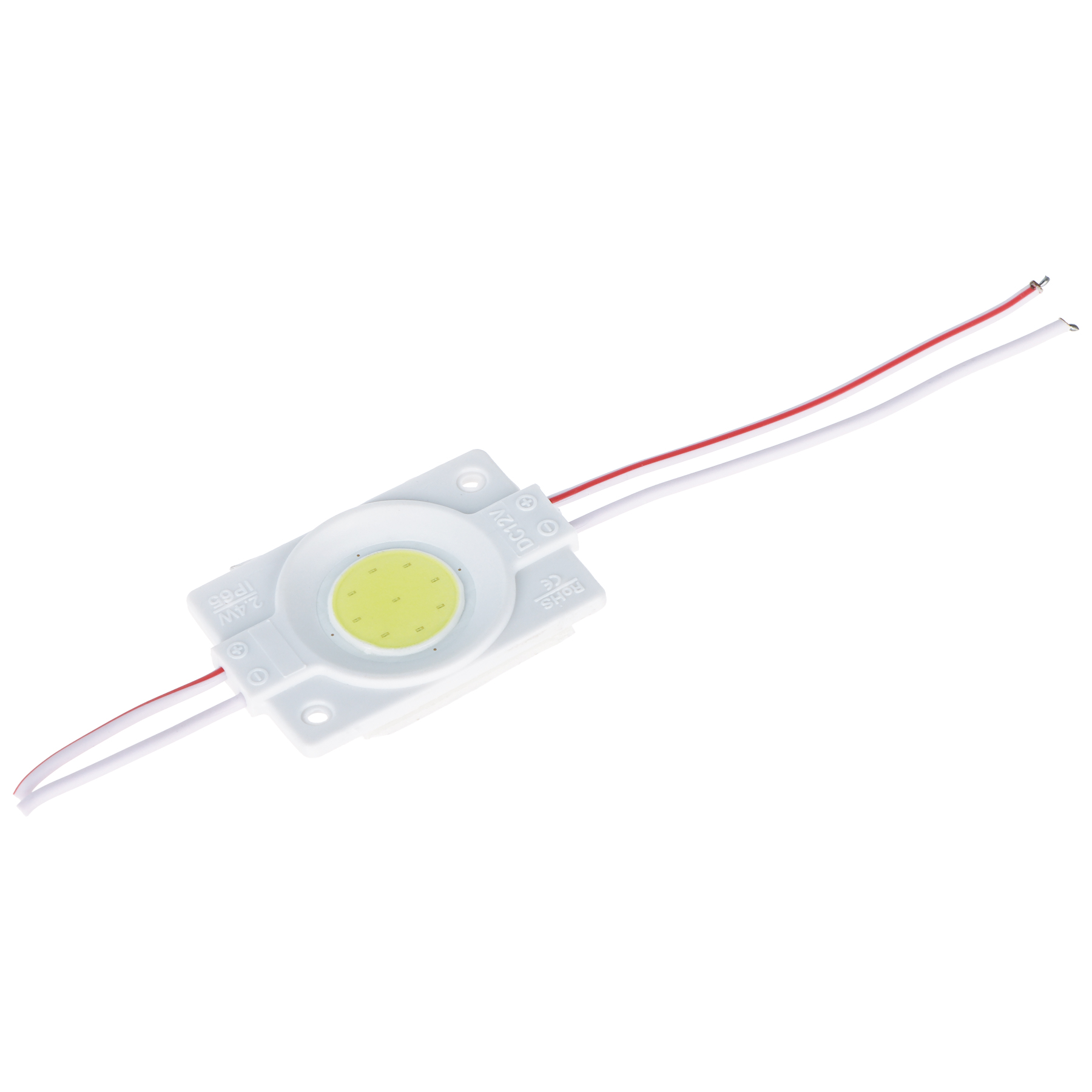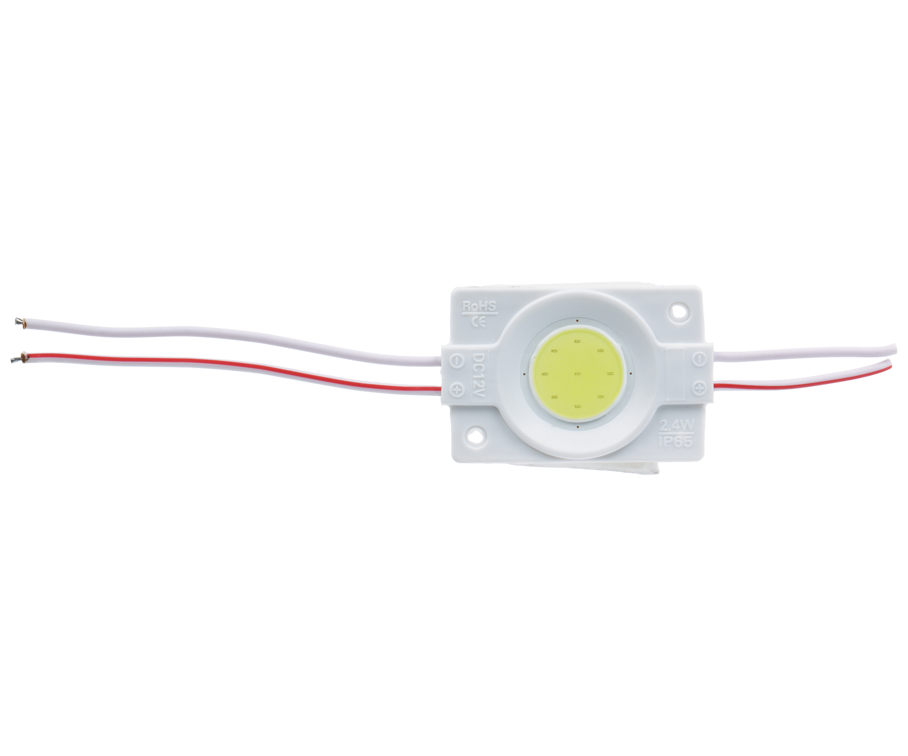 LED module for use in letters of light, advertising boxes, POS systems, to backlight of furniture, etc.; Rated voltage: 12 V DC ; Power consumption: 2.4 W ; Color: Neutral white - 5000 K ; Number of LEDs: 9 pcs LED COB diodes ; Luminous flux: 200 lm ; Illumination angle: 140 ° ; "Index of Protection": IP65 ;