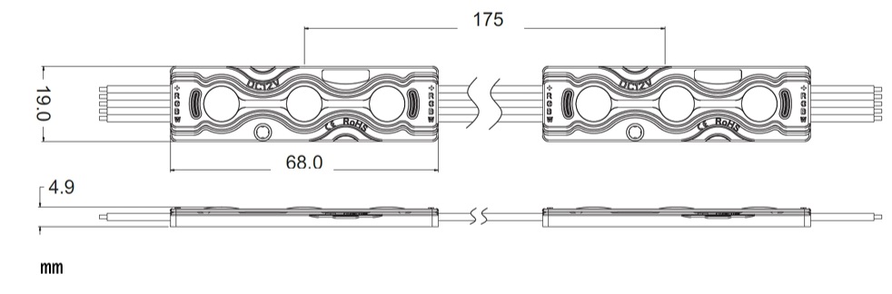 LED module for use in letters of light, advertising boxes, POS systems, to backlight of furniture, etc.; Rated voltage: 12 V DC ; Power consumption: 0.96 W ; Color: RGBW, 6000 ... 8000 K ; Number of LEDs: 3 pcs LED SMD 5050 diodes (one module) ; Luminous flux: RGBW : 3 ... 4 / 7 ... 9 / 3 ... 3.5 / 18 ... 20 lm ; Illumination angle: 120 ° ; "Index of Protection": IP67 ;