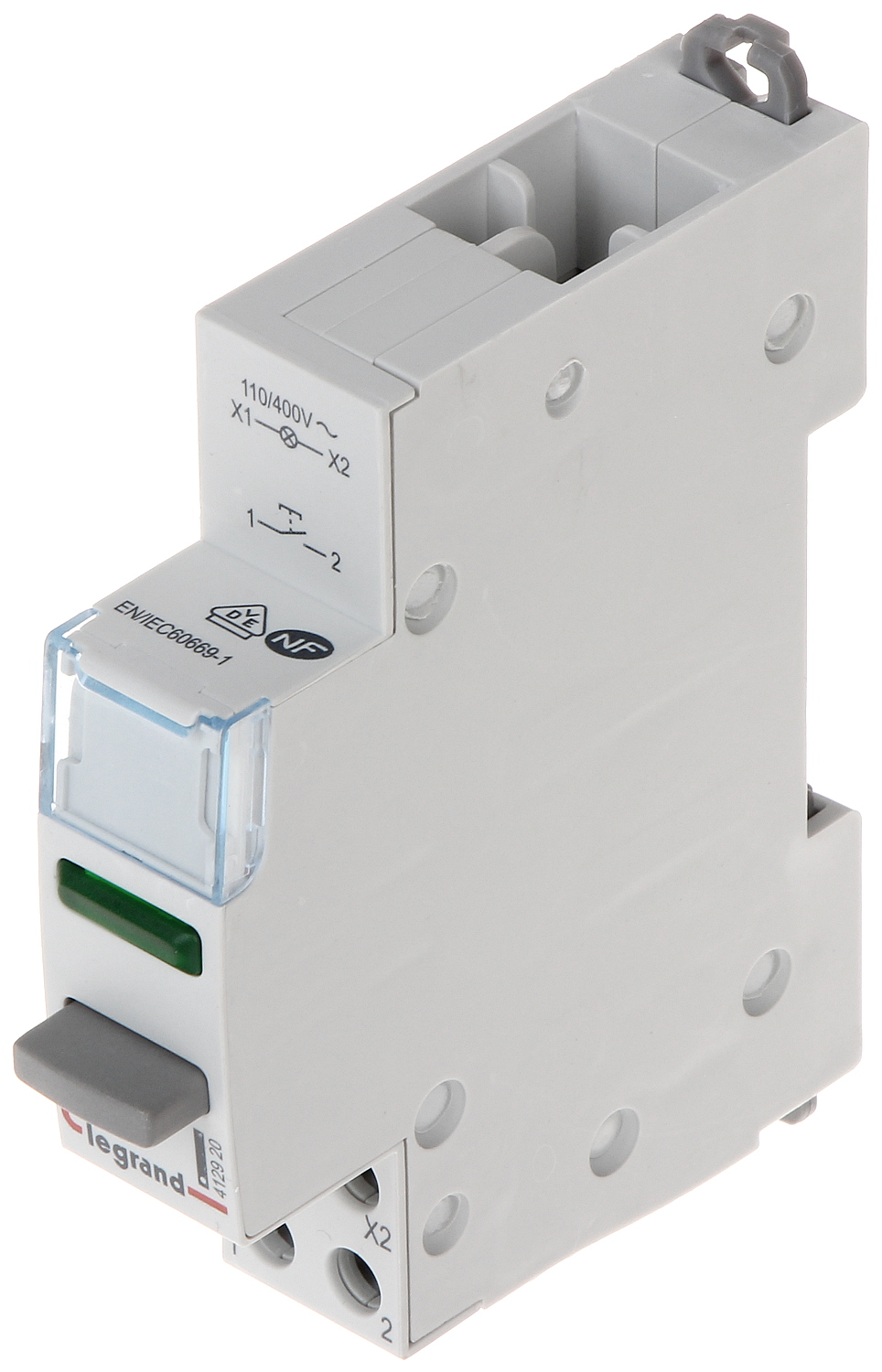 LED indicator: Green 110 / 400 V AC ; Rated current: 20 A ; Rated voltage: 250 V AC ; Category of use: AC12 ; Connectors type: screw terminals ; Housing: DIN, TS-35 rail mounting ; Width in 17.5 mm modules: ;
