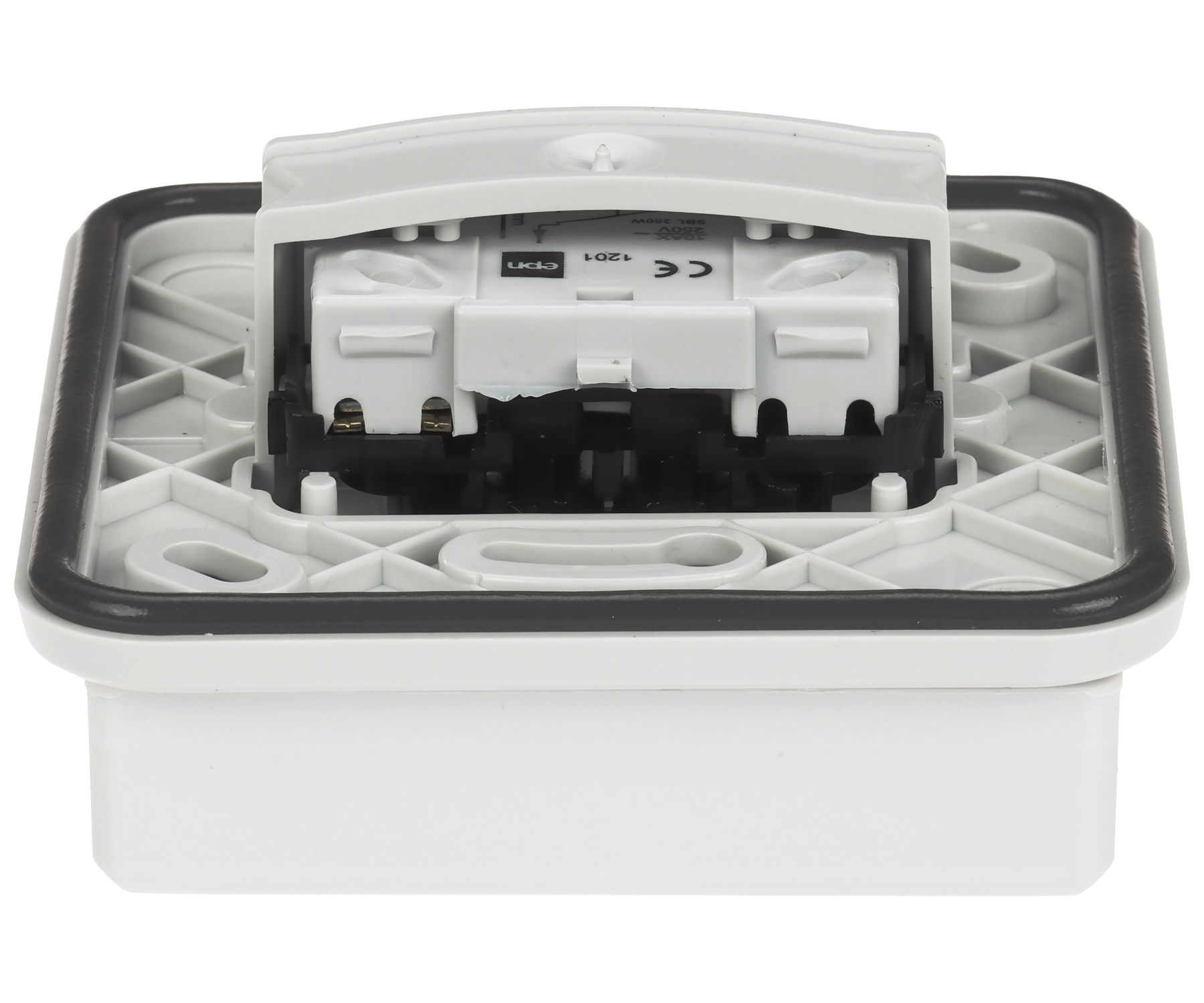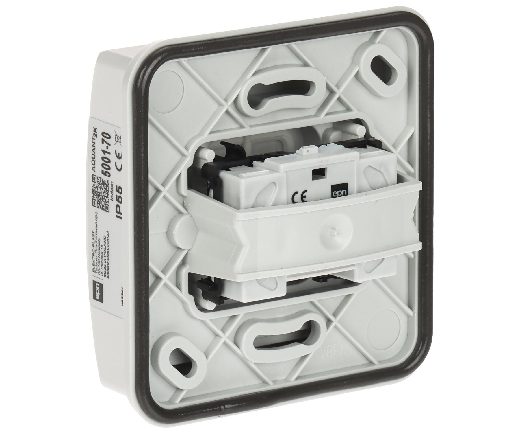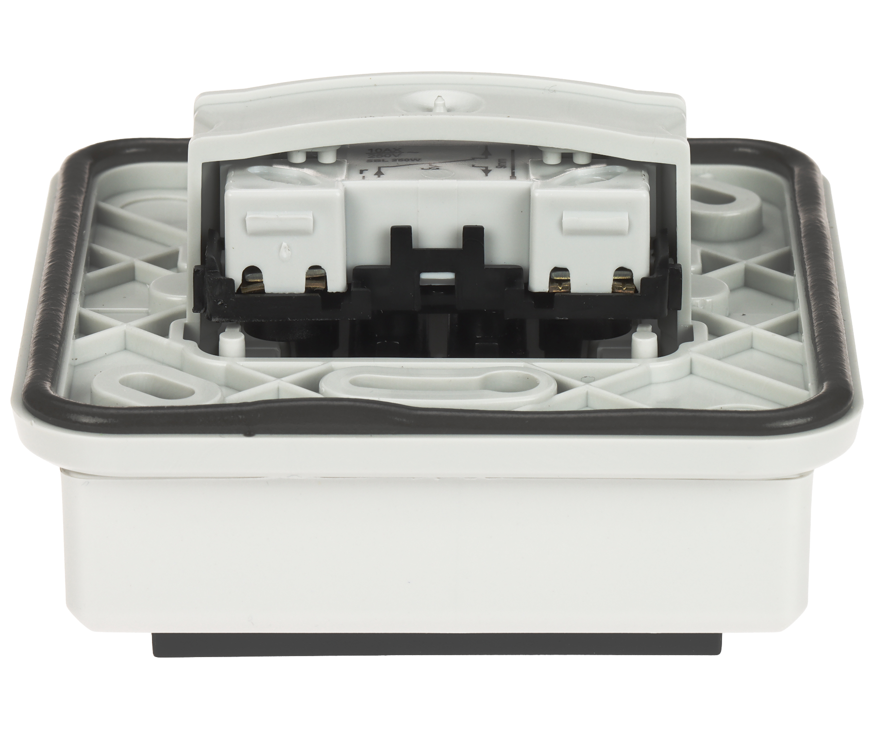 Device type: Two-way Switch ; Rated voltage: 250 V AC ; Rated current: 10 A (inductive load) ; Connectors type: screw terminals ; Main features: Additional protection integrated with the base in the form of movable rubber glands ; "Index of Protection": IP55 ; Color: Gray + Anthracite grey ;