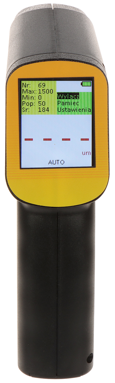 Application: Paint thickness measurement - steel sheet, galvanized steel sheet, aluminum sheet, detection of zinc layer ; Probe: embedded, point, elastic, terminated with so-called ball ; Measurement resolution: 1 µm Fe, 5 µm Al ; Measurement range: 0 ... 2000 µm ; Memory: 960 measurements ; Main features: Automatic recognition of the type of tested substrate, Automatic detection of zinc (Zn) layer on a steel sheet, Clear graphical interface ;