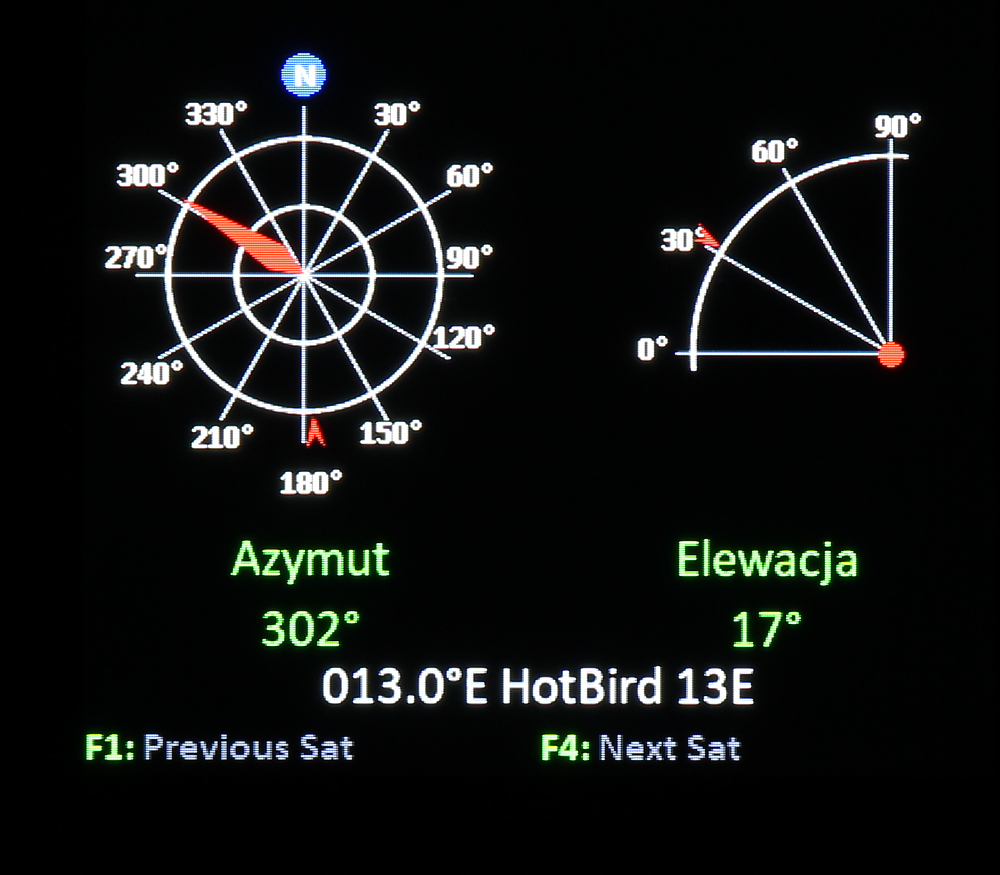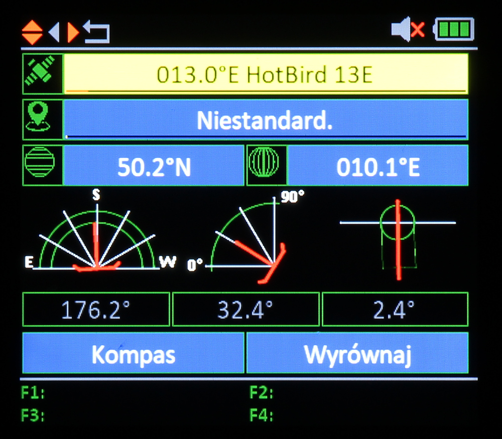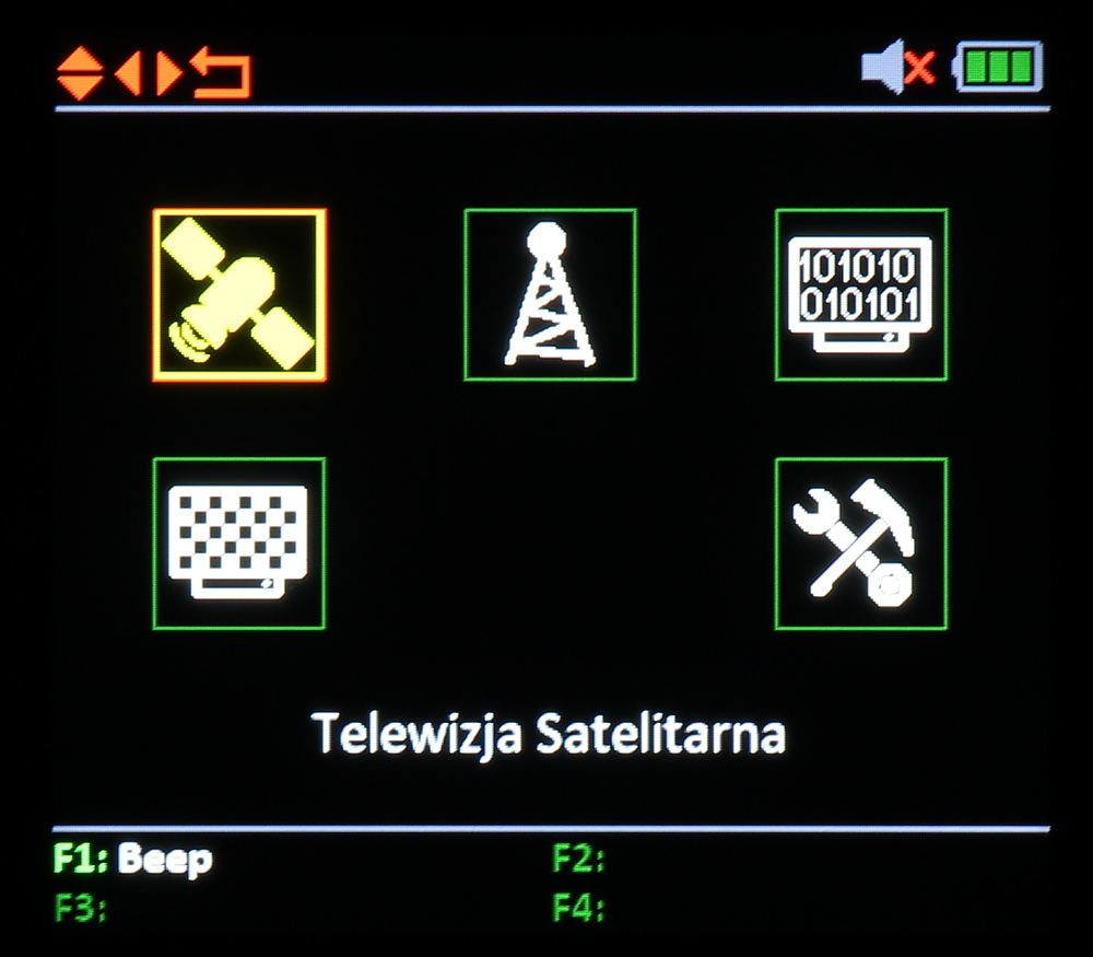 • DVB-S/S2 : Power measurement, Measurement of CNR, CBER, VBER (DVBS), LBER (DVBS2), Real-time spectrum analyzer, Possibility of displaying signal parameters for 4 transponders on one screen - Easy identification for Quattro LNB, Satellite identification function, Satellite location function, Calculation of the azimuth and elevation angles, Measurement of azimuth and elevation, DisEqC automatic identification,