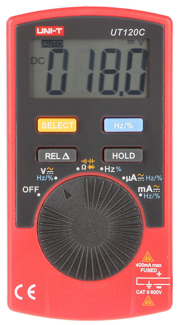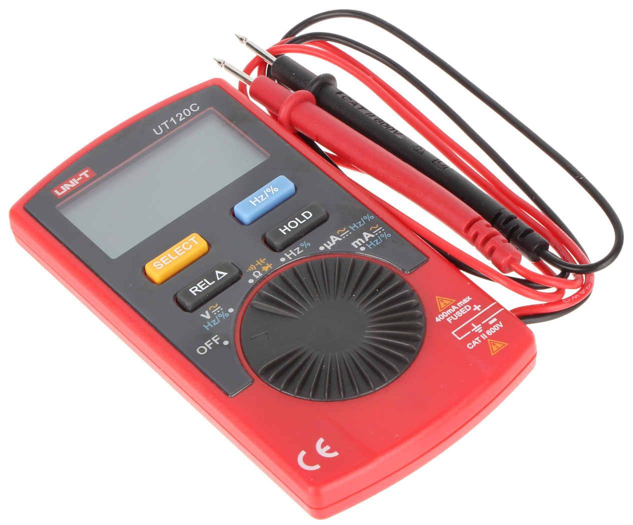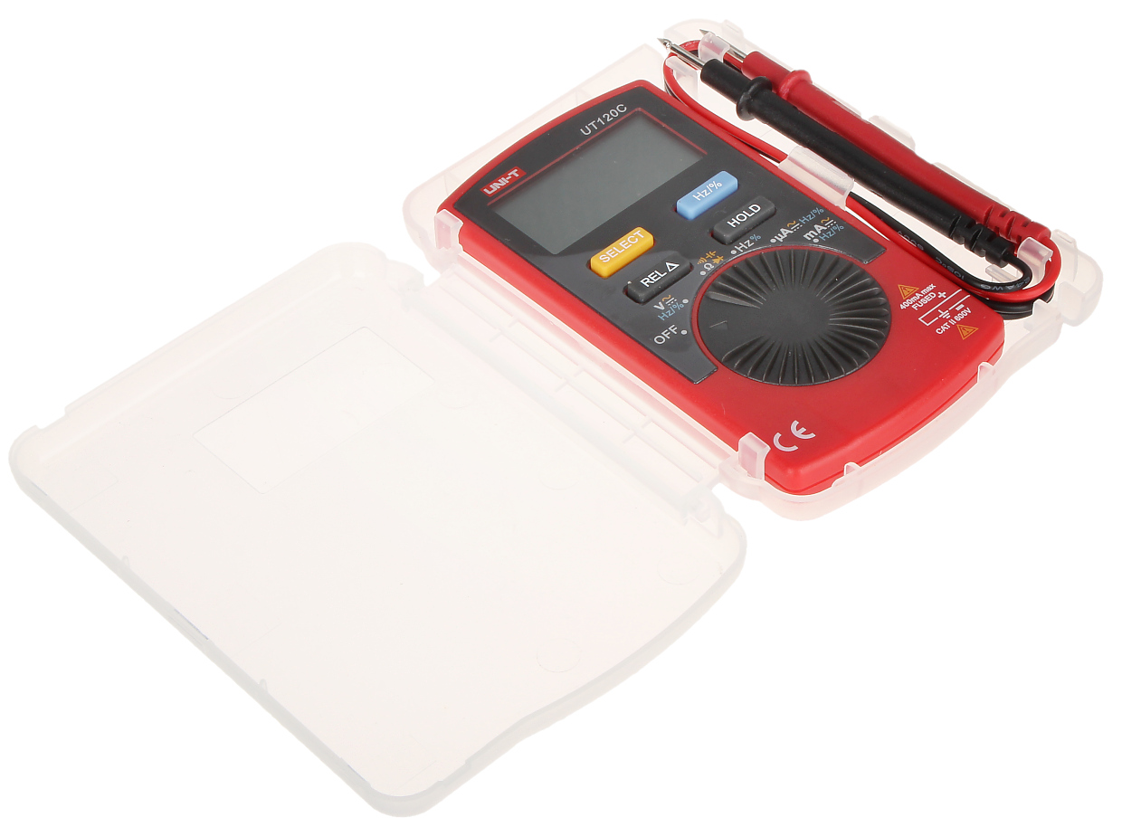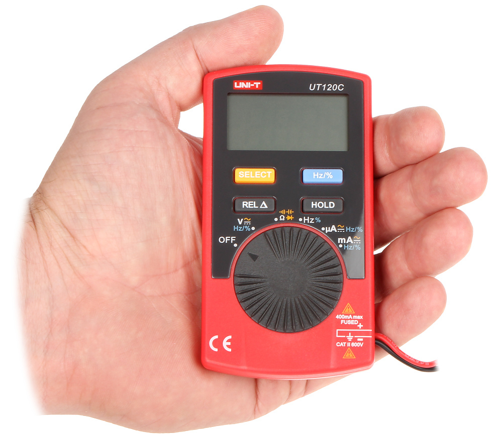 The UT-120C is a universal digital meter used to measure: voltage, current, resistance, frequency and to check the correct operation of diodes; Automatic change of measuring ranges; Main features: Hold - stopping the meter reading, REL - relative measurement mode ;