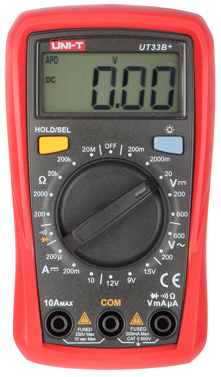 UT-33B+ is a universal digital meter used to measure: voltage, current, resistance; The device also has a built-in battery tester; Main features: Measurement of the battery discharge level: 12V, 9V, 1.5V ;
