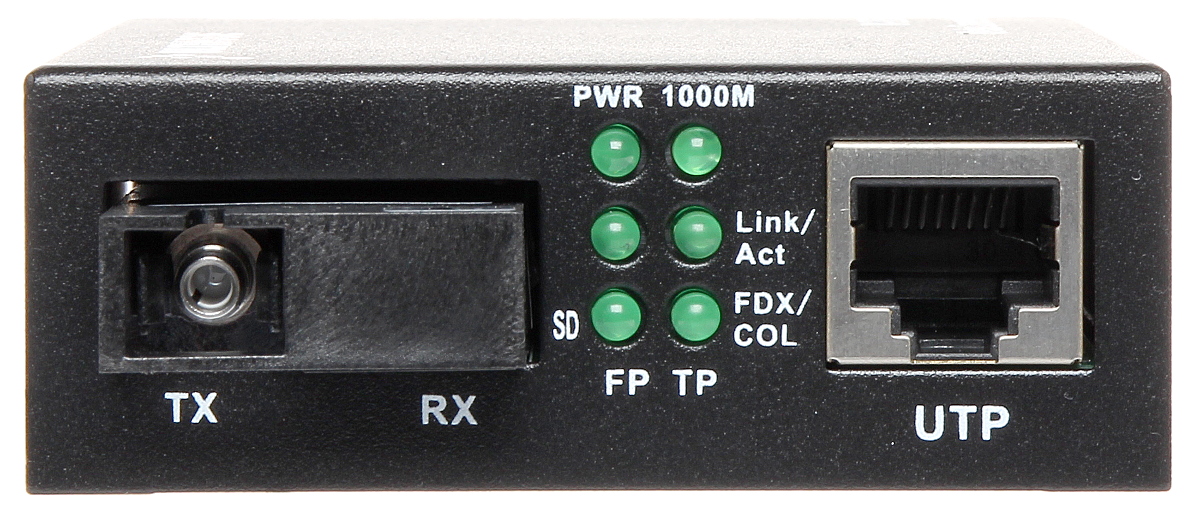 Fast Ethernet converter (Gigabit Ethernet) twisted-pair cable <-> single-mode fiber; Optical signal is transmitted and received in the II i III transmission window of 1310/1550 nm; Optical connector type: SC / PC ; Transmission range: 20 km - Single-mode fiber ; Transmission speed: 10 / 100 / 1000 Mbps ;