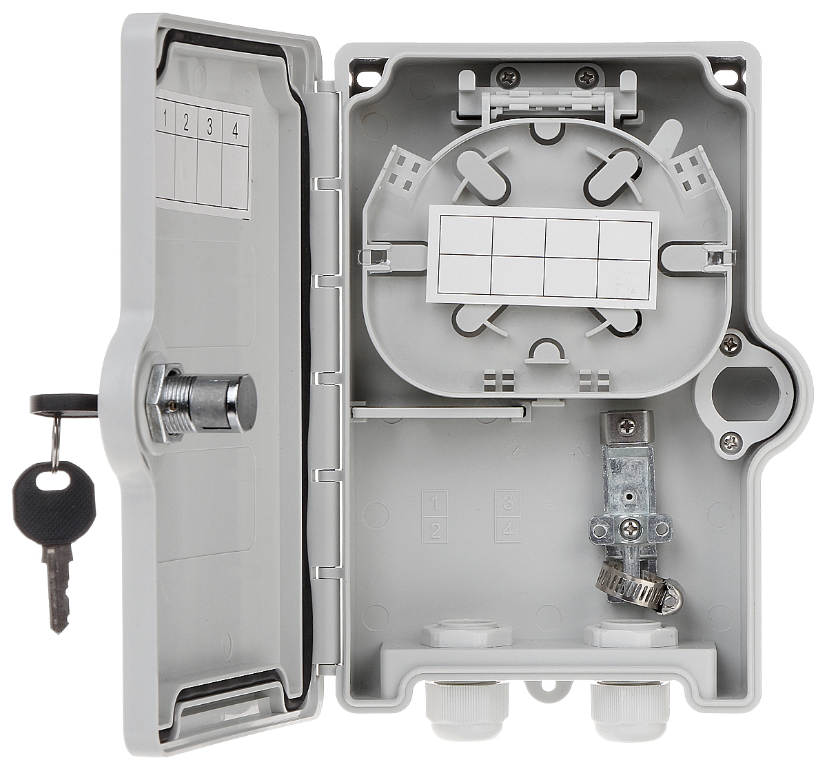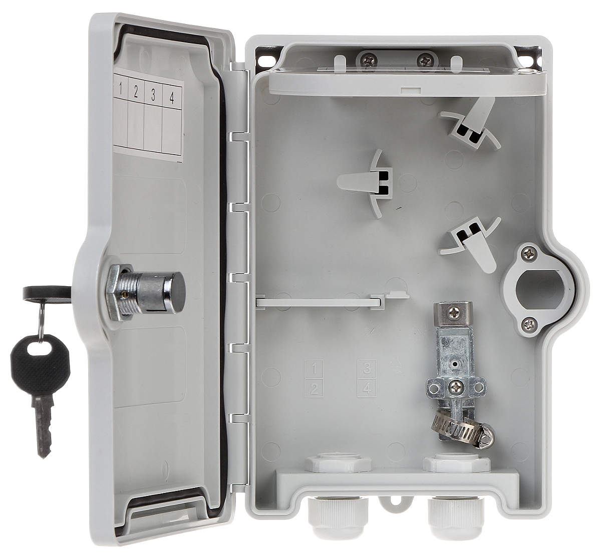 Number of line cables: max. 1 ; Number of splice cassettes: max. 1 ; Main features: 2x SC - simplex, 2x FC - simplex, 2x LC - duplex ; Housing type: Wall-mounted, hanging ; Key closed; "Index of Protection": IP65 ;