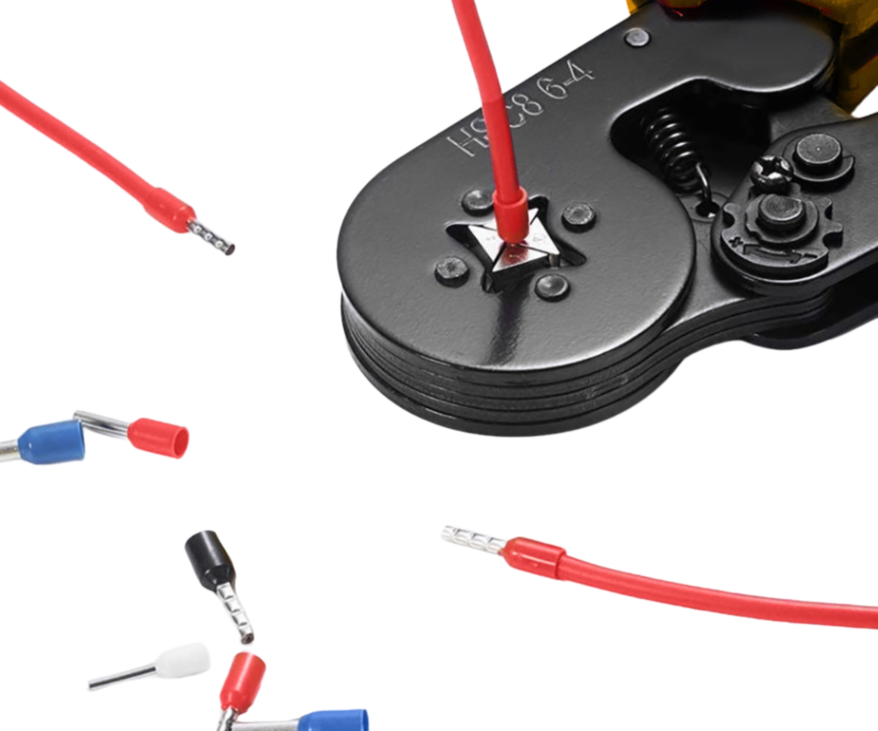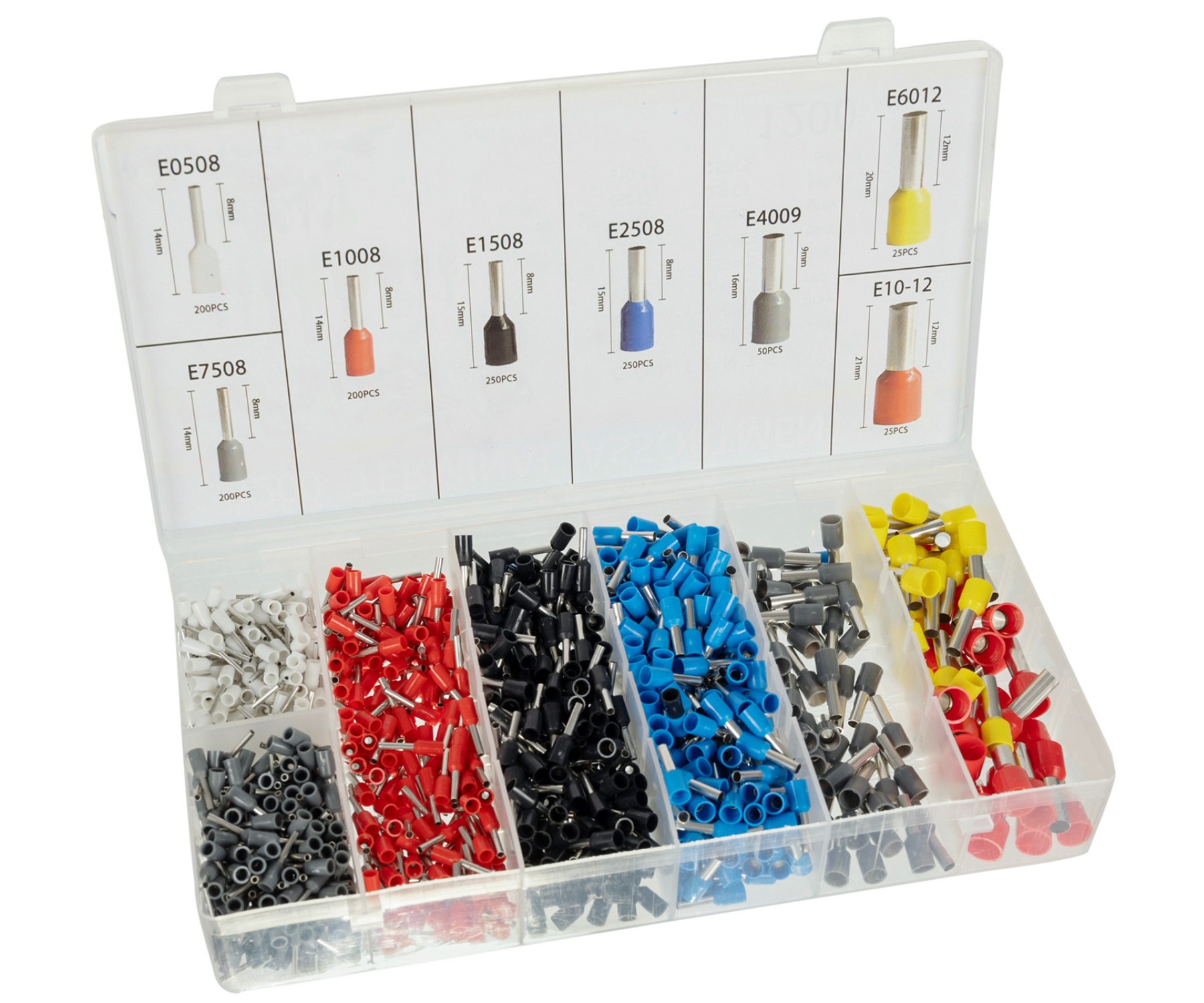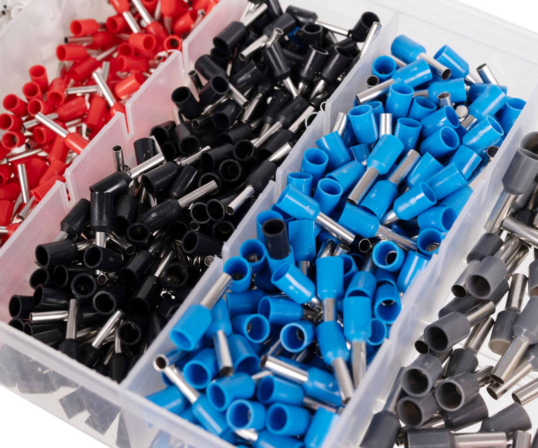 The kit includes a cable ferrule crimping tool and an organizer that holds 8 different sizes of cable ferrules; Set of cable ferrules from 0.5 mm2 to 10 mm2 with organizer; Number of pcs. in package: = 1200 pcs (total) ;