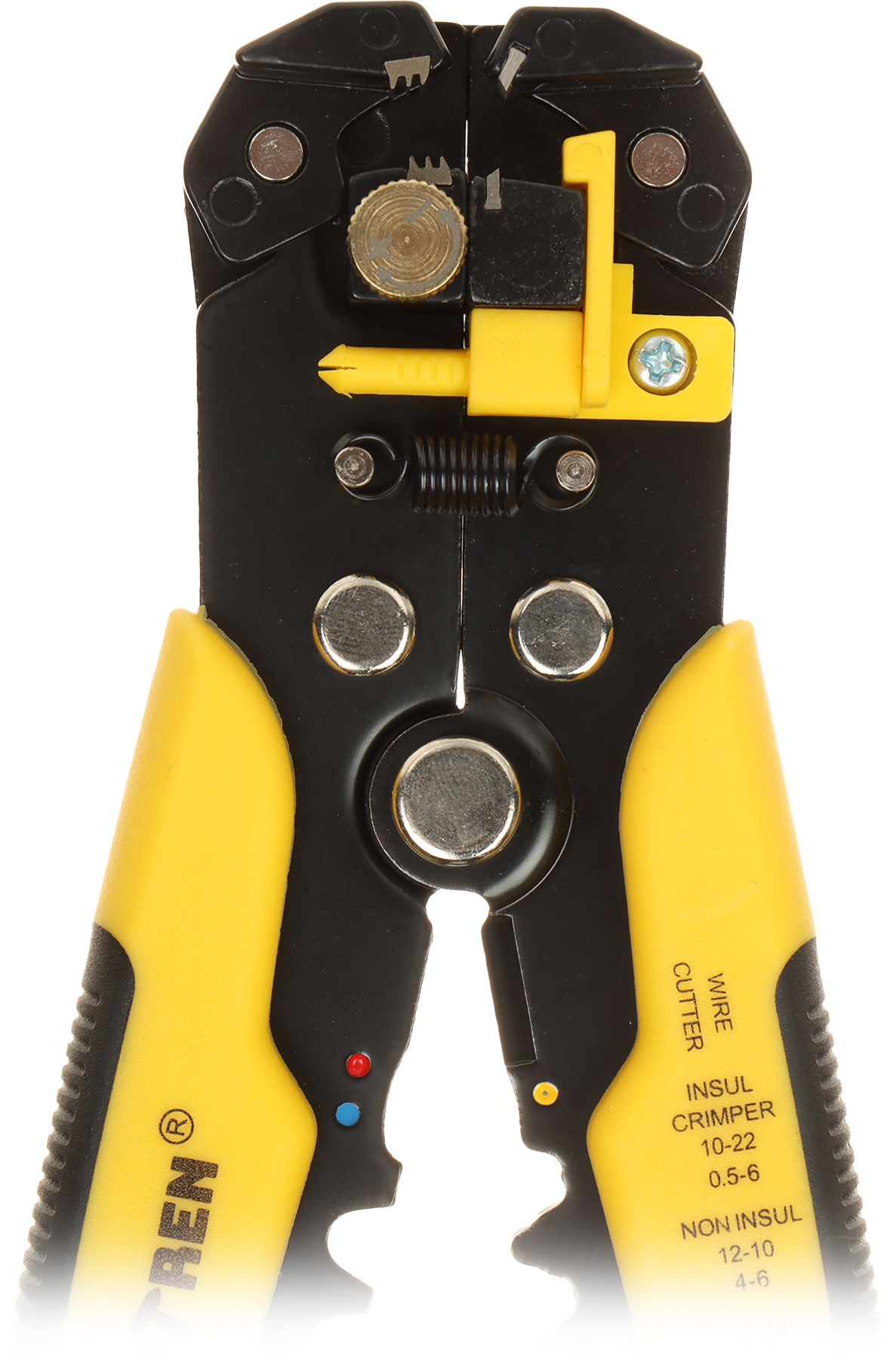 Application: Wire 0.2 ... 6 mm² ( 24 AWG ... 10 AWG ) ; Main features: Breaking force adjustment knob, Self-adjusting mechanism according to wire size provides excellent wire stripping without damaging the conductor, Adjustable stop with lengths scale, Cutter ;