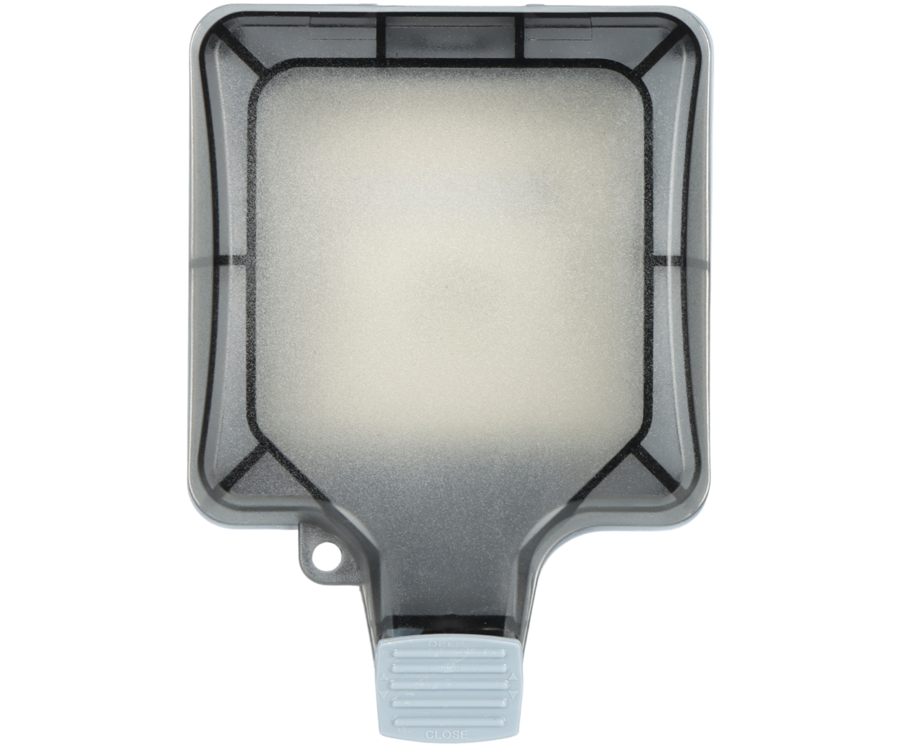 • The semi-transparent box cover opens on hinges and closes with a latch