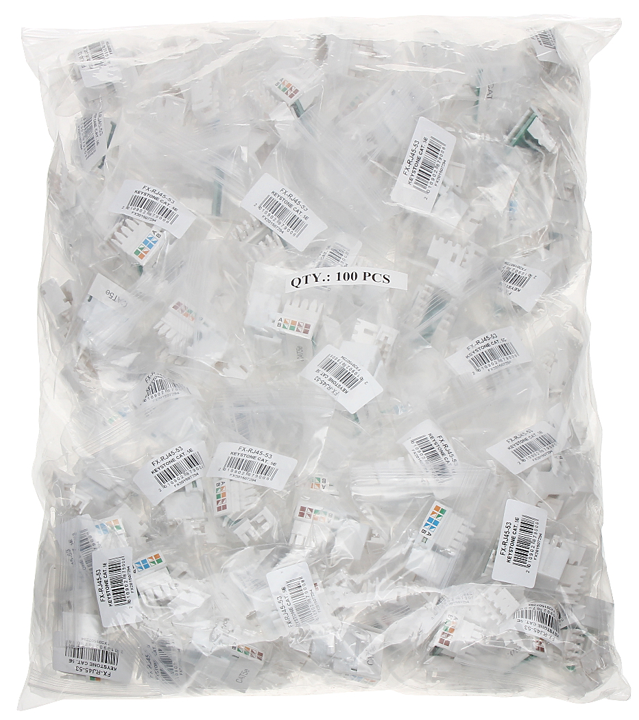 In package: 100 pcs The price for package ; Connector type: Socket RJ45 ; Color: White ; Wire mounting: KRONE quick-connector - Fixing of the bottom (angular), snap closure ; Application: Patch panel Keystone, UTP cat. 5e ;