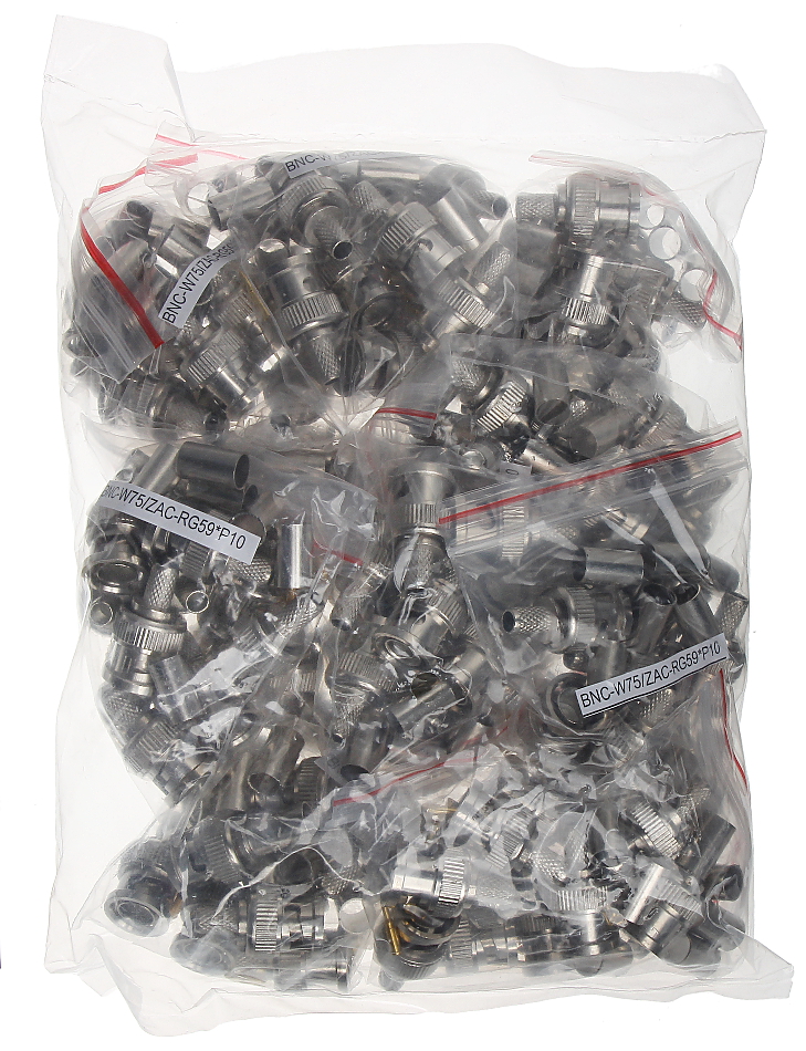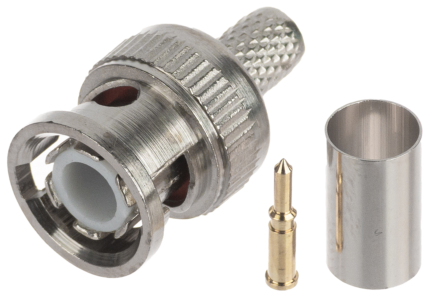 In package: 100 pcs The price for package ; Connector type: BNC Straight plug ; Attachment of connector elements: Crimping ; Application: Coaxial cable ; Cable diameter: max. 5.9 mm ;