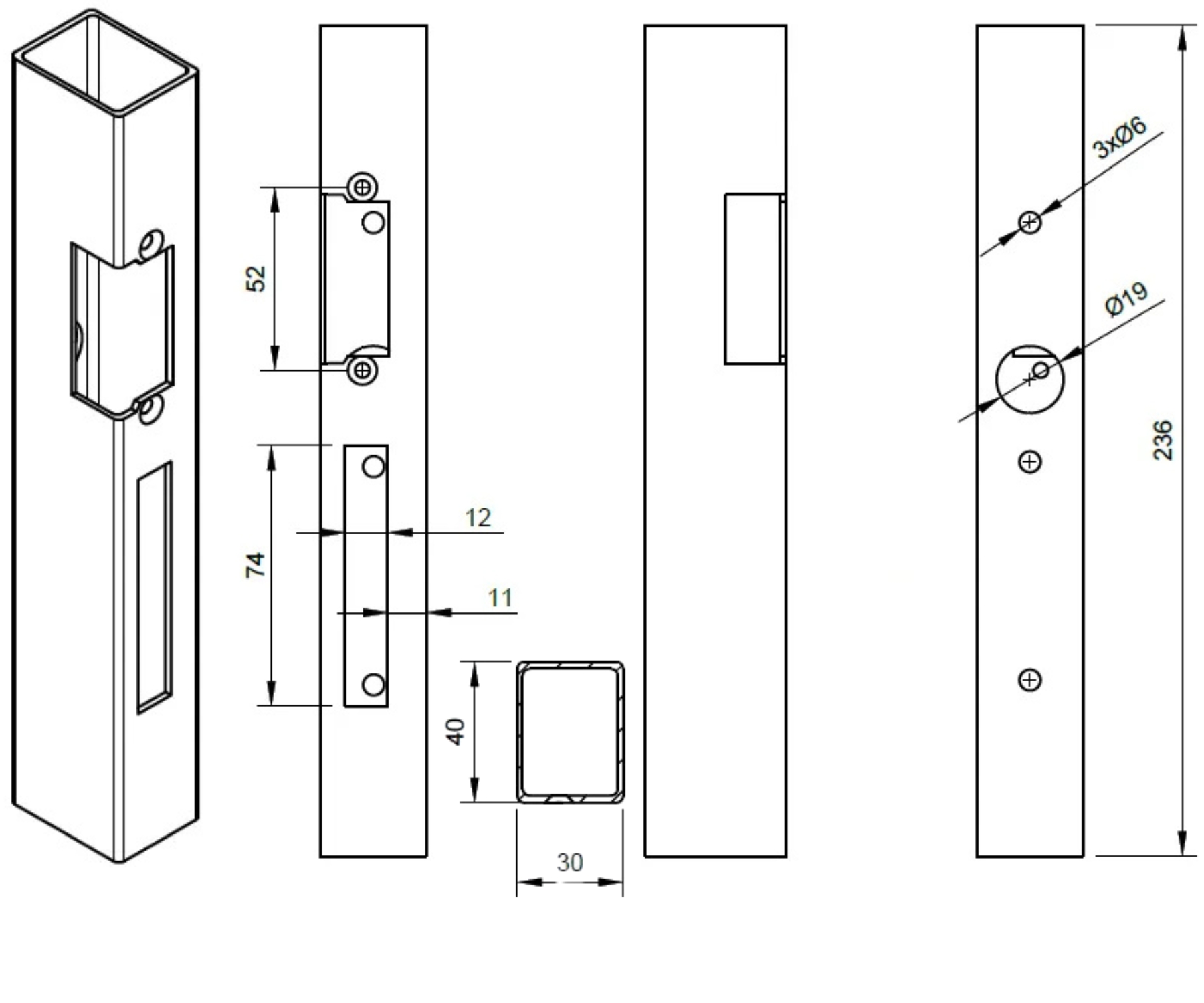Application: right-side door ; Dimensions: 30 x 236 x 40 mm Plate thickness 1.5 mm ;