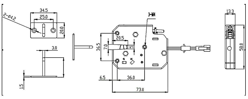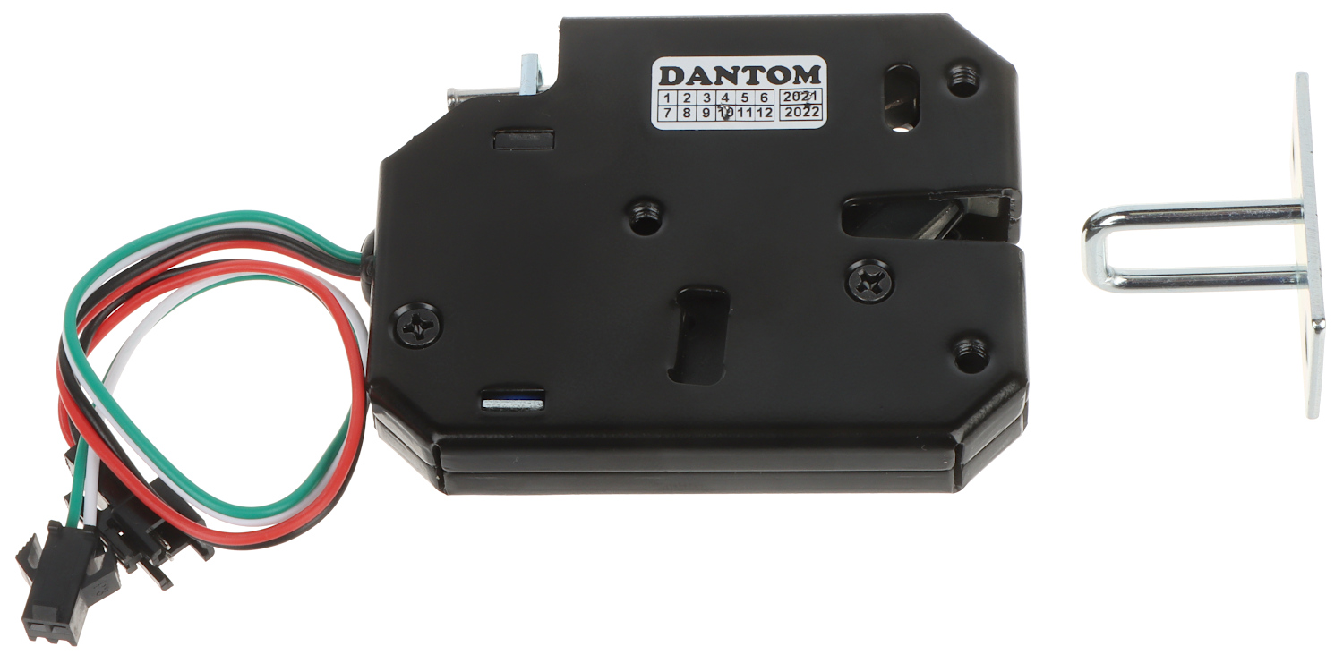 Rated voltage: 12 V DC ; Application: right-side door / left-side door ; Main features: Built-in spring lever (the lock mechanism pushes the lock latch when open) Maximum diameter of the lock latch : 3 mm ;