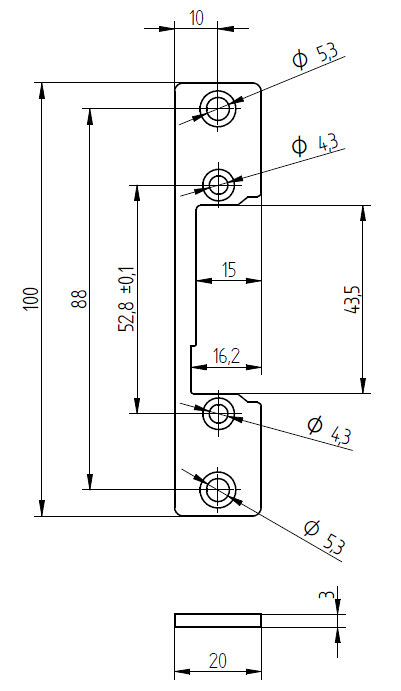 Flat, short, universal plate adapted for left- and right-hand door. Plate is zinc coating covered; Dimensions: 100 x 20 x 3 mm ;