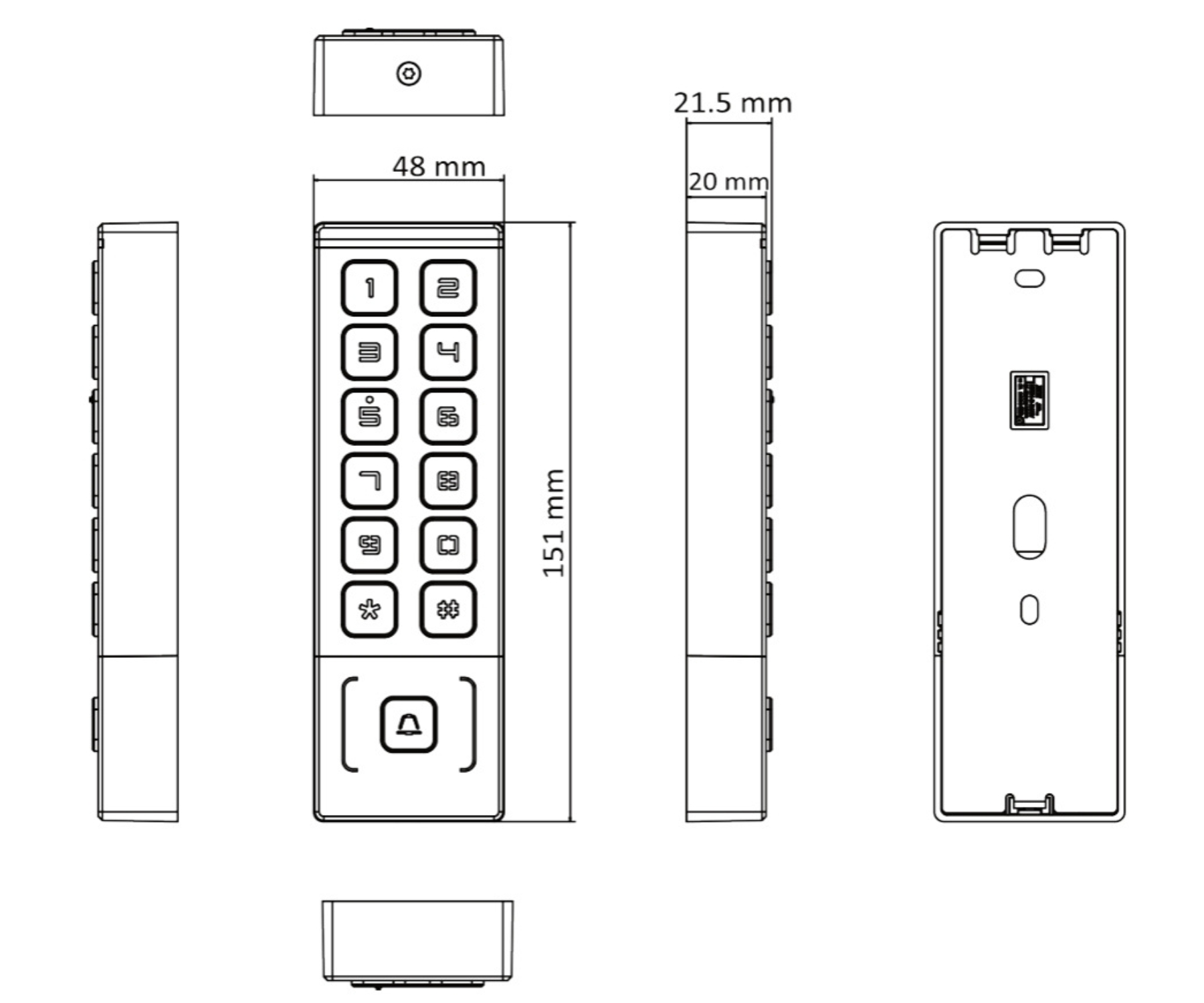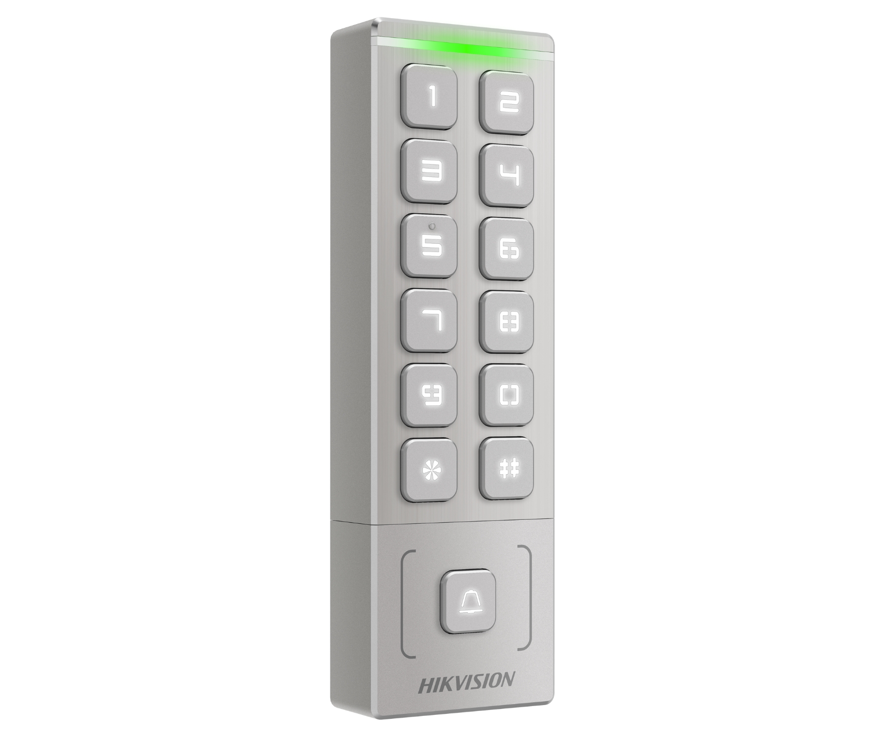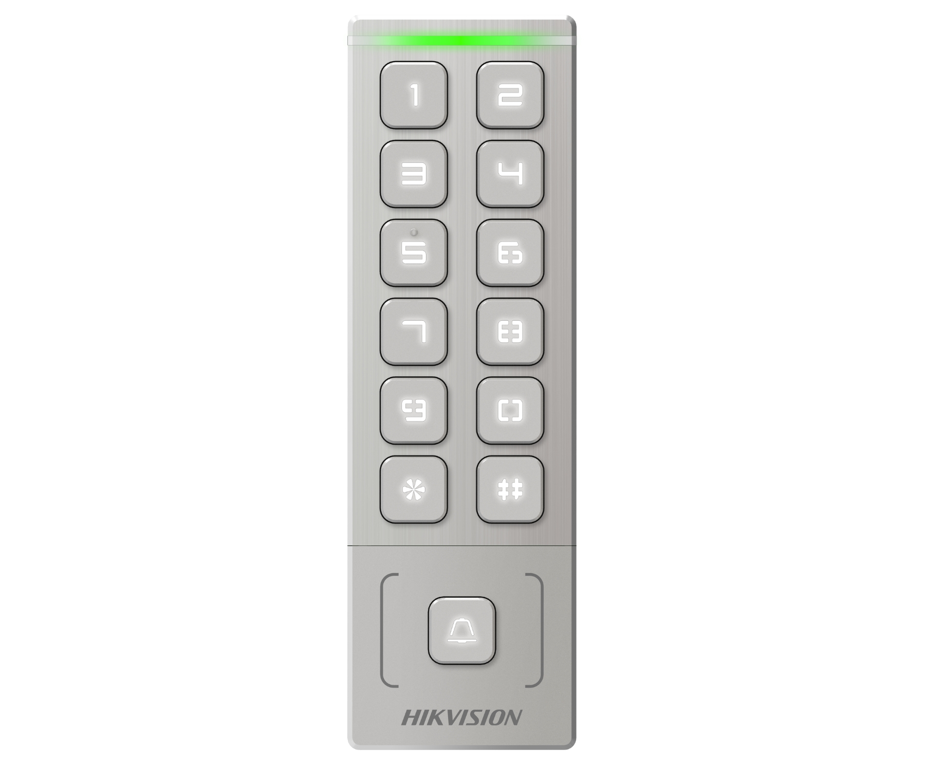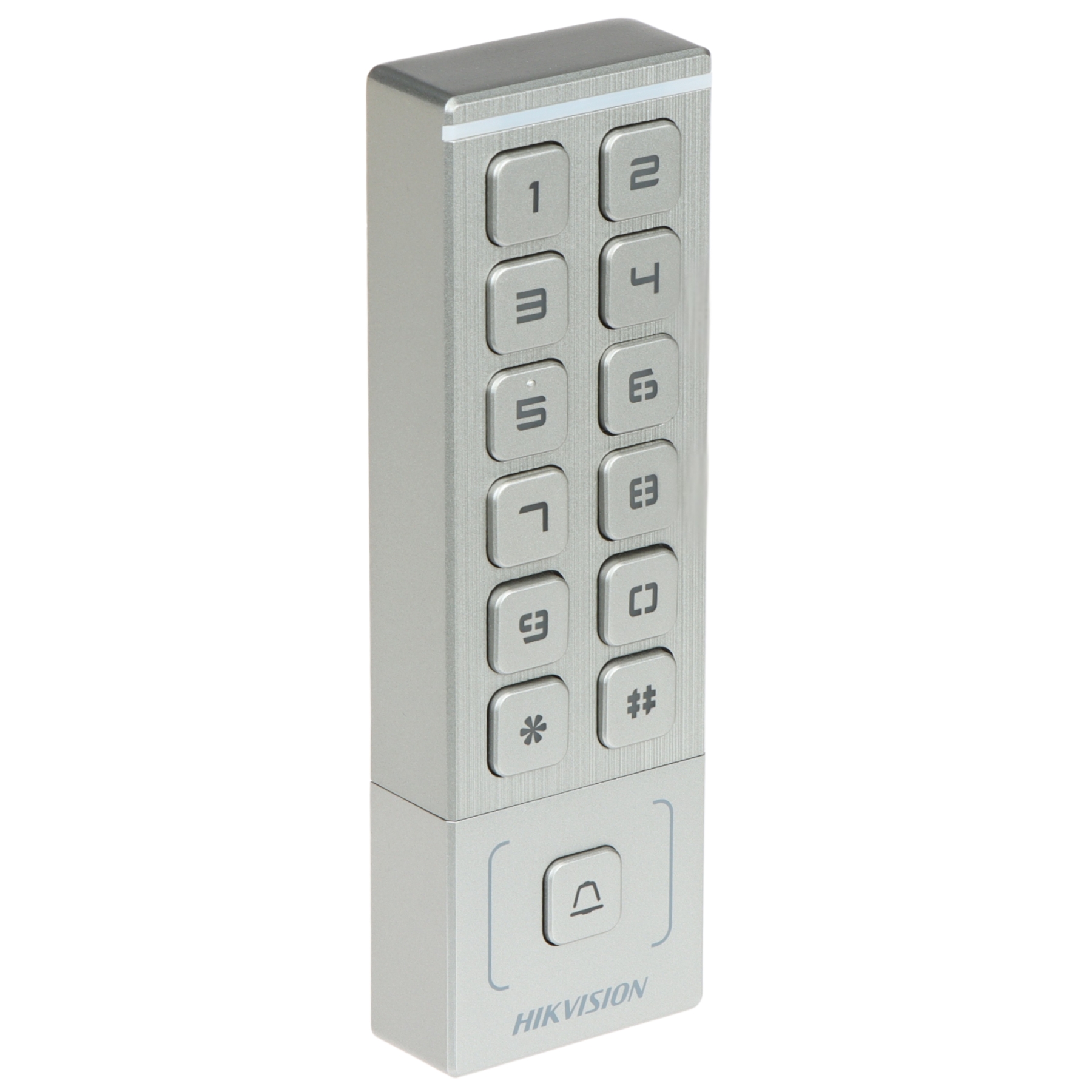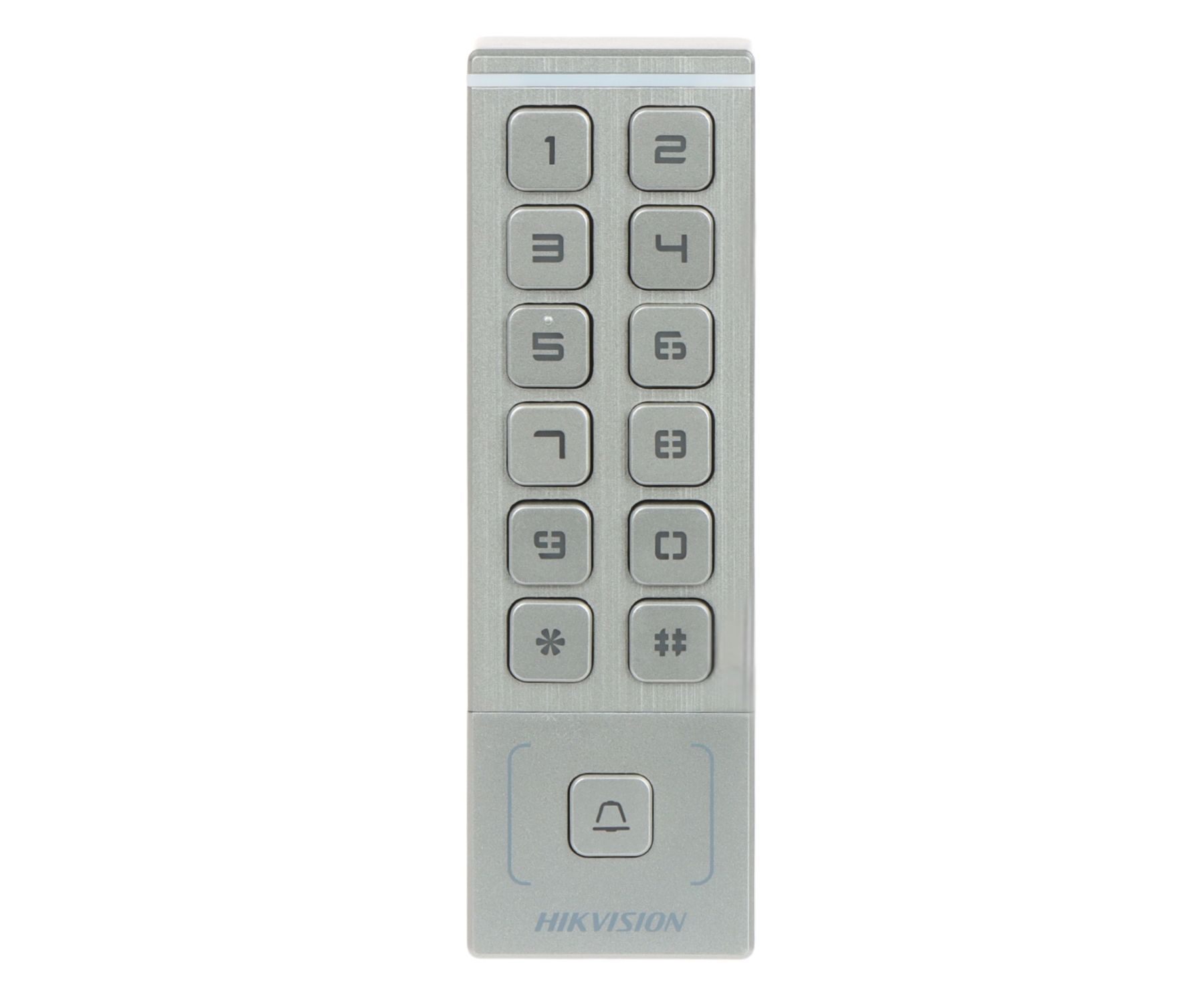 Outdoor, autonomous code lock with RFID reader; Cards support: 13.56 MHz S50 ; Reading distance of prox-keys: 3 cm ; Keyboard built-in; Communication: Wiegand 34/26 ; Doorbell button; Main features: Number of relay outputs : 1 pcs NO/NC, 1000 indexed users, Memory of 1000 RFID cards, Identification: Card and/or PIN, Alarm output ; "Index of Protection": IP65 ; Housing: Metal ;