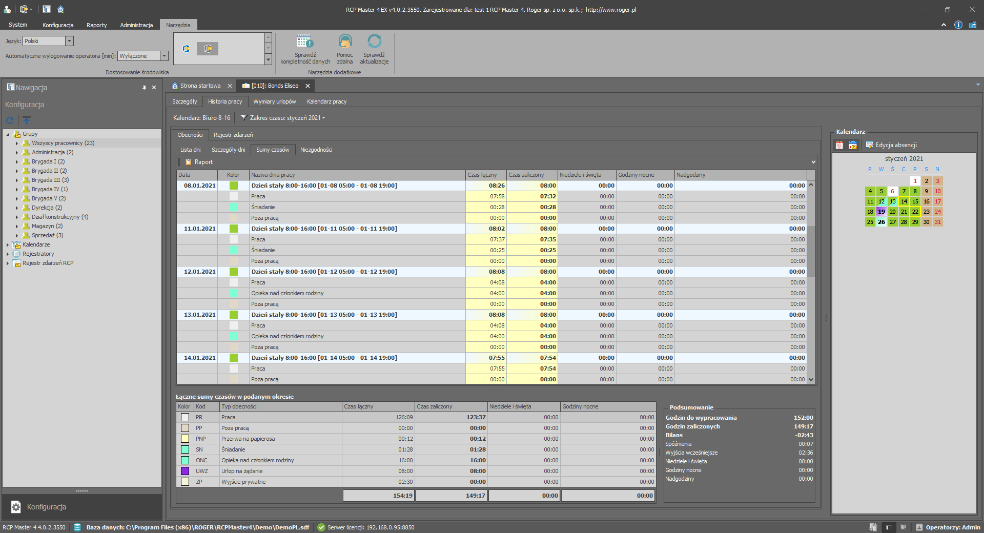 Individual work time calendars with the possibility to correct calendars for particular employees (e.g. working in different time, changeover, etc.)