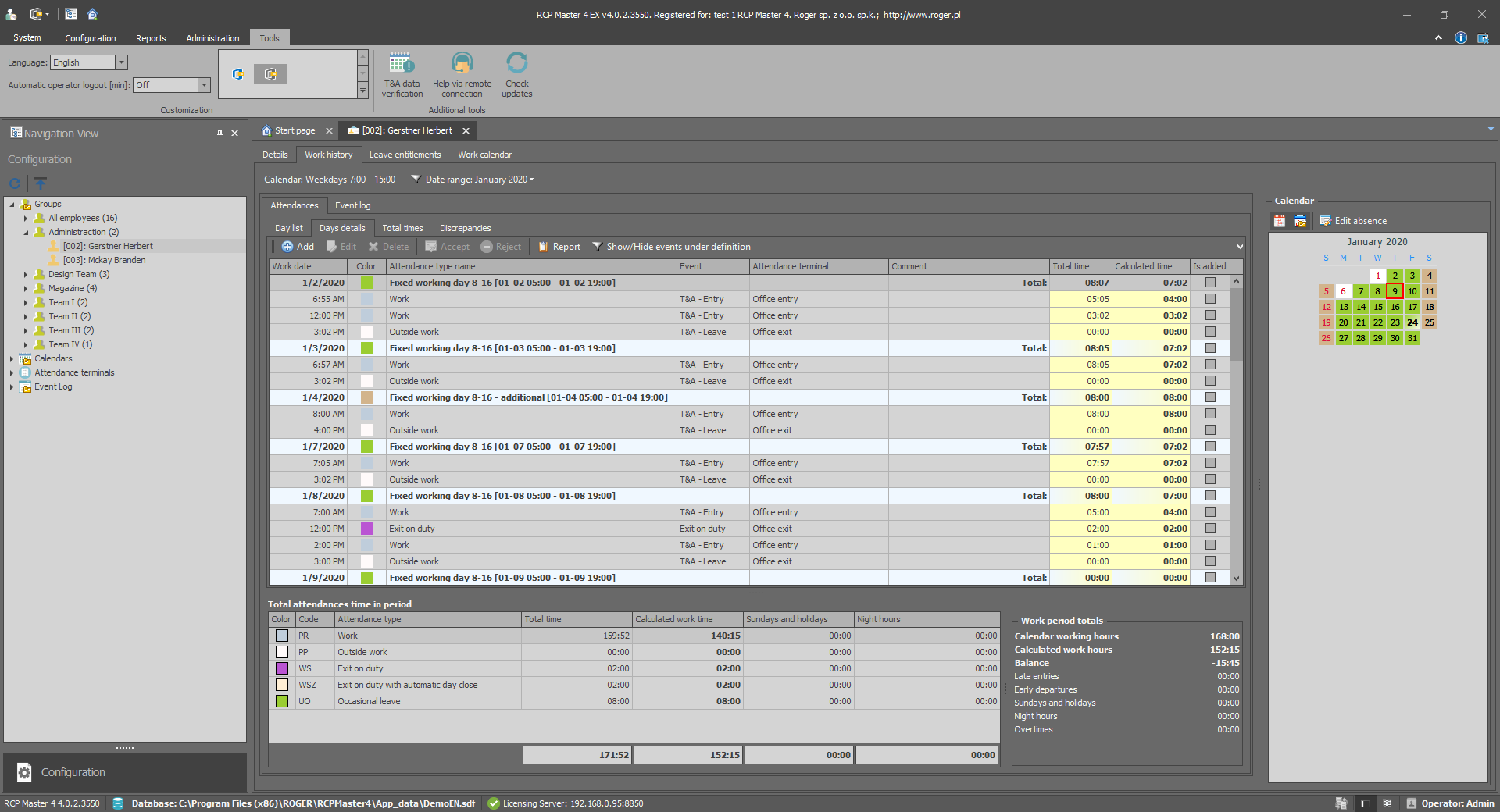Definition of access granting types, calendars, attendance and absence types, maximal and minimal attendance times (e.g. maximal daily break of particular type)
