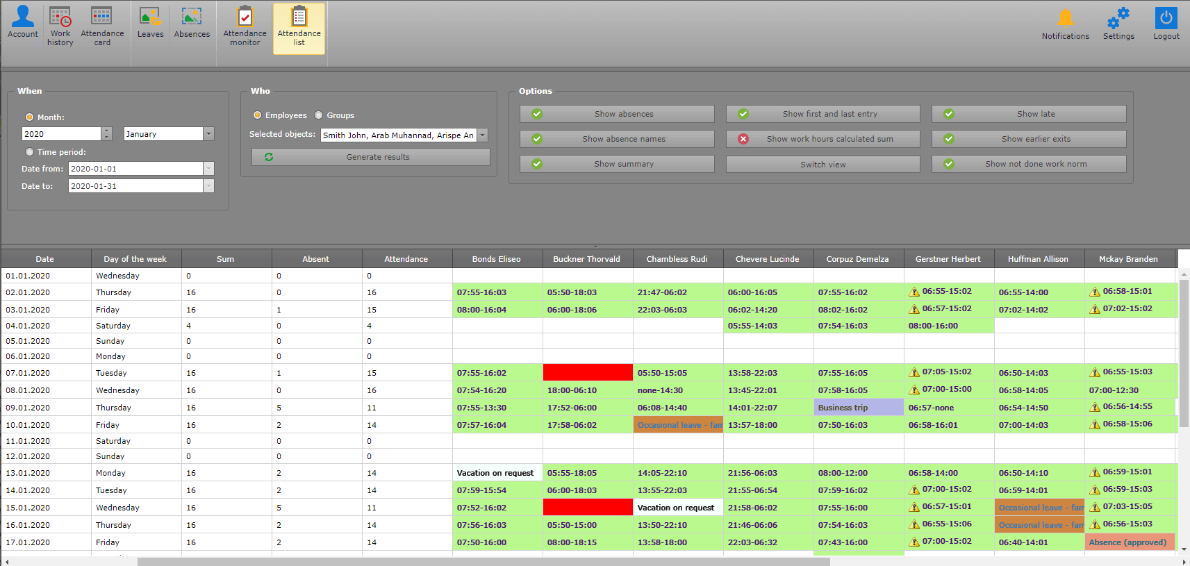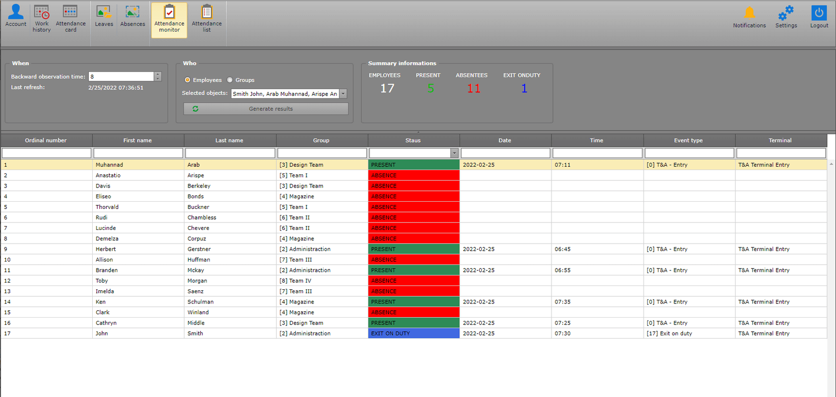 Displaying the current status of the attendance of employees (present, absent, on a business trip, etc.)