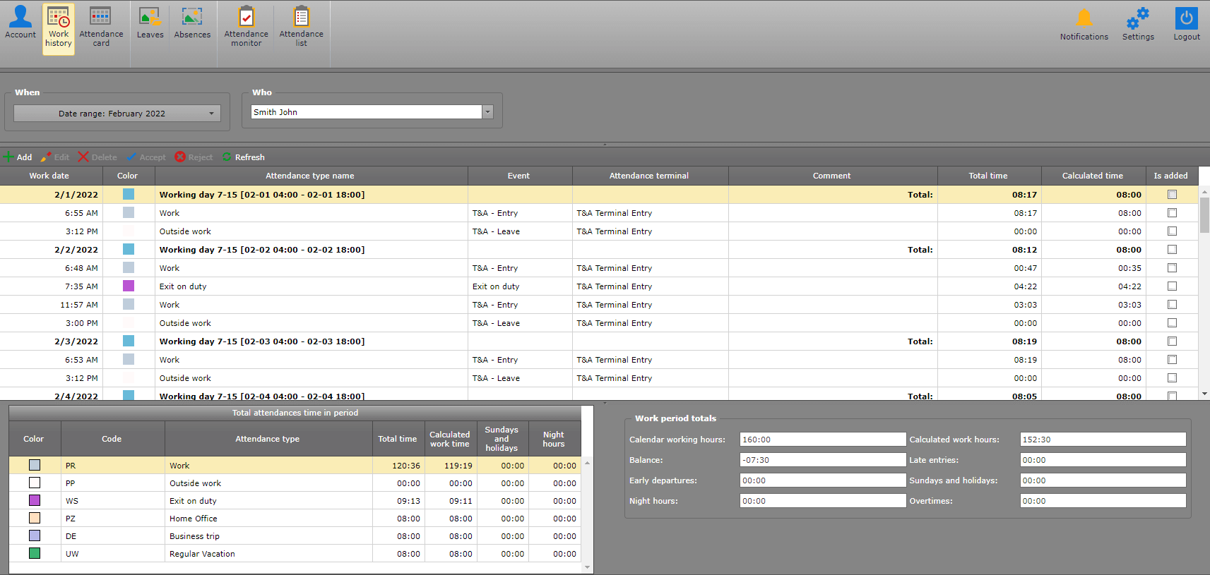 Graphical visualization of employee attendance (attendance list)