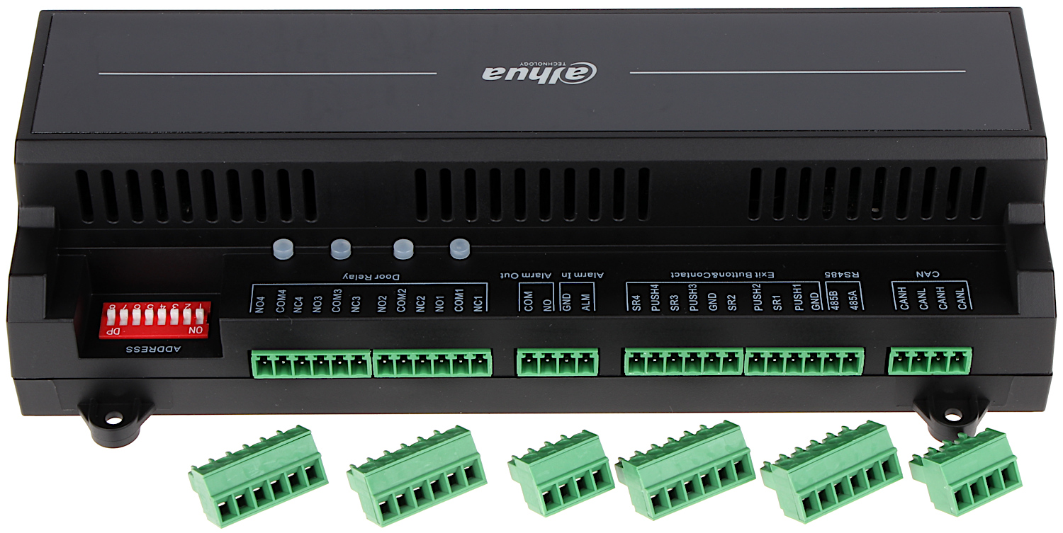 Number of served transitions: 4 (two-way) ; Number of supported readers: 4 pcs ; Output lines: 5 pcs - Relay ; Communication: RS-485, Wiegand 34/26, Control panel CAN (Controler Area Network) ;