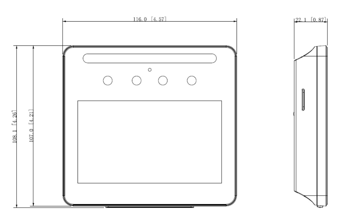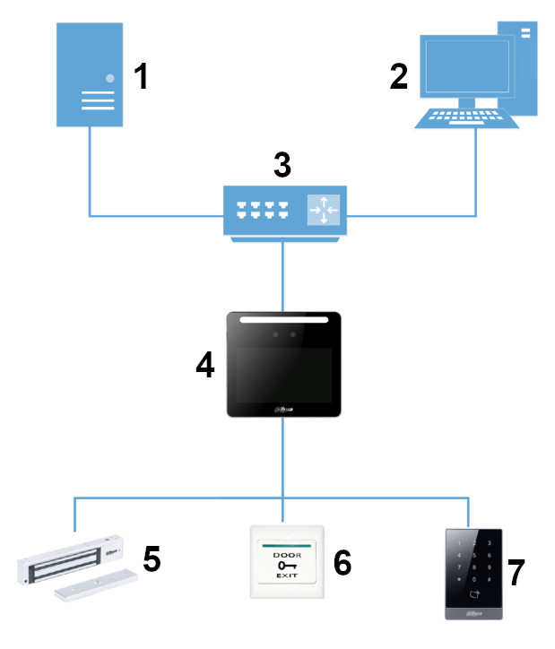 Access controller with face recognition function; Resolution: 1920 x 1080 ; IR illuminator; LED illuminator; Face recognition distance: 0.3 m ... 1.5 m ; RFID proximity reader built-in: 13.56 MHz S50 ; Internal memory: Support storage of 150 000 records ; RS-485 interface; Alarm inputs / outputs: 1 / 1 ; Audio: Voice message ; Power supply: 12 V DC ;