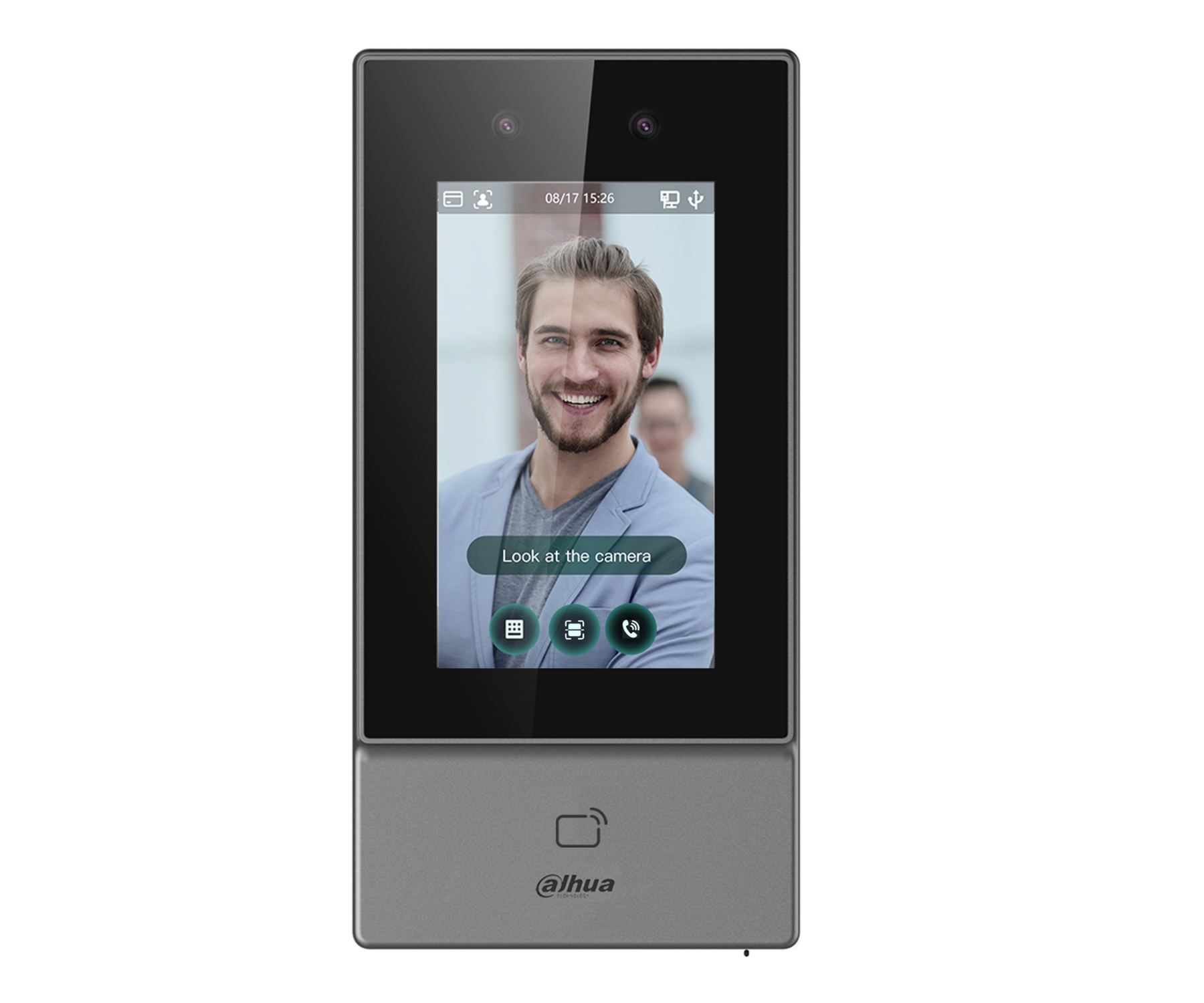 Face recognition distance: 0.3 m ... 1.5 m ; RFID proximity reader built-in: 13.56 MHz S50 ; Wiegand interface; Alarm inputs / outputs: 1 / 1 ; Power supply: 12 V DC ;