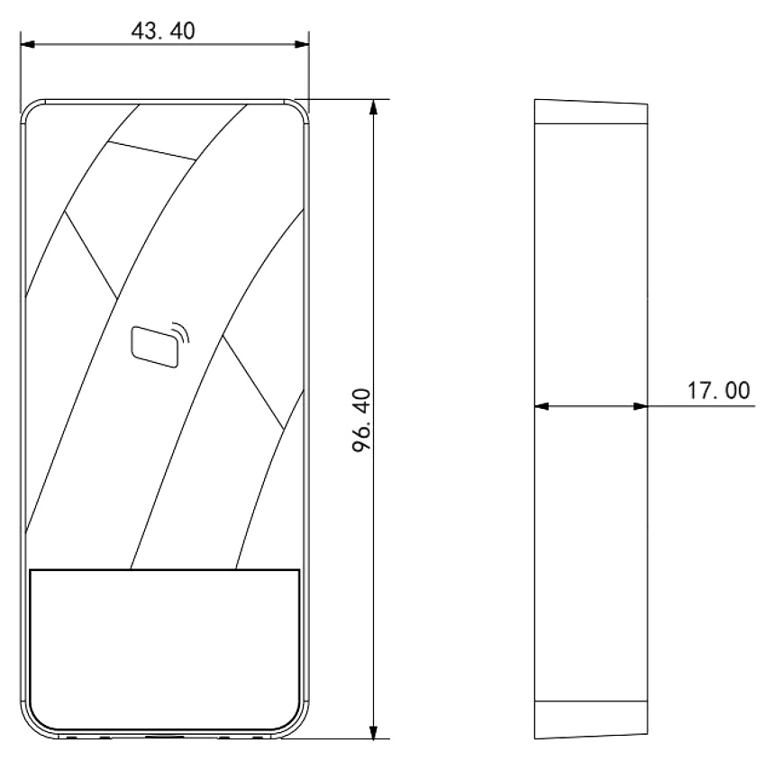 Cards support: 13.56 MHz S50 ; Reading distance of prox-keys: max. 3 ... 6 cm ; Communication: RS-485, Wiegand 34 ; Housing: Plastic, Waterproof ;