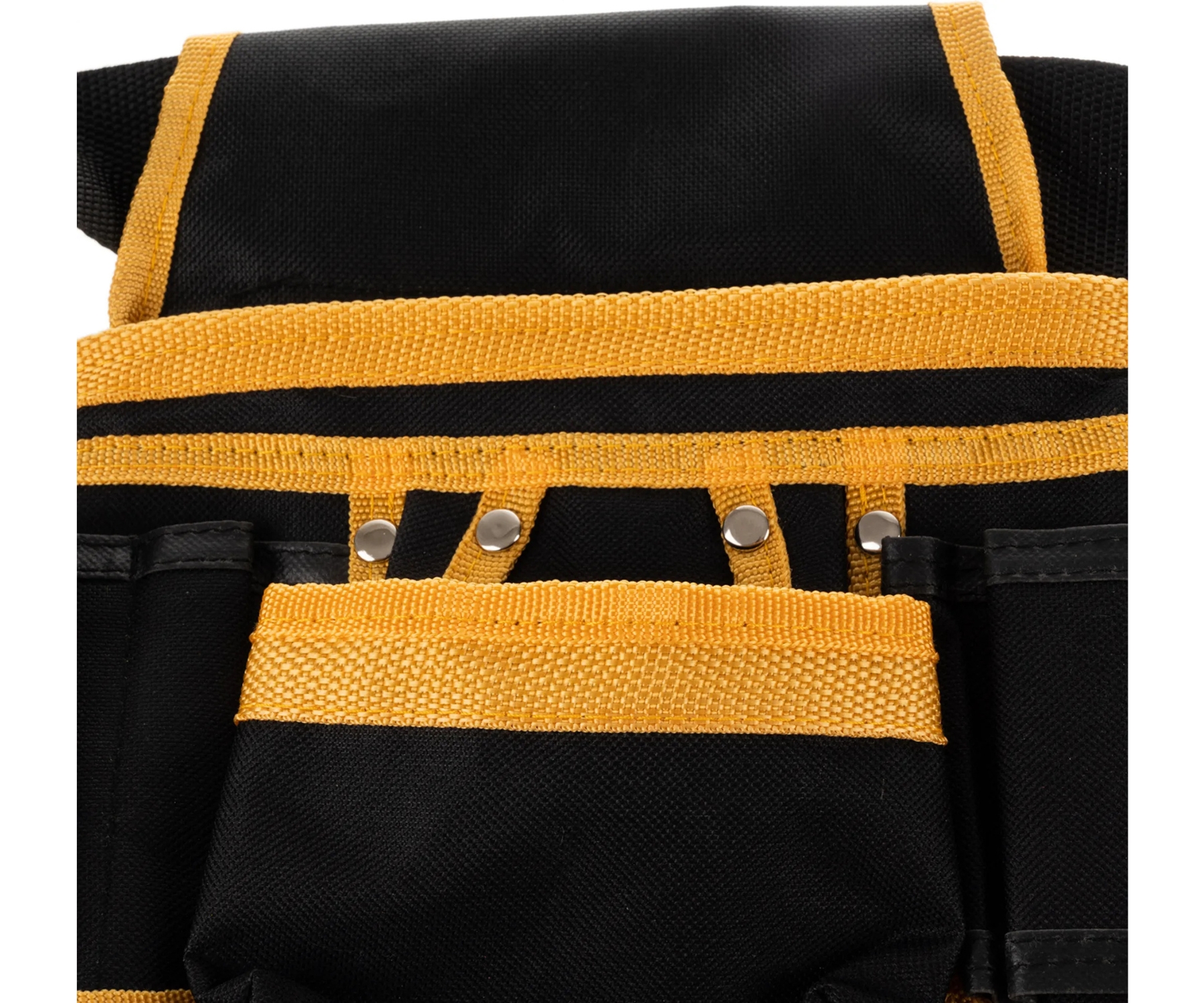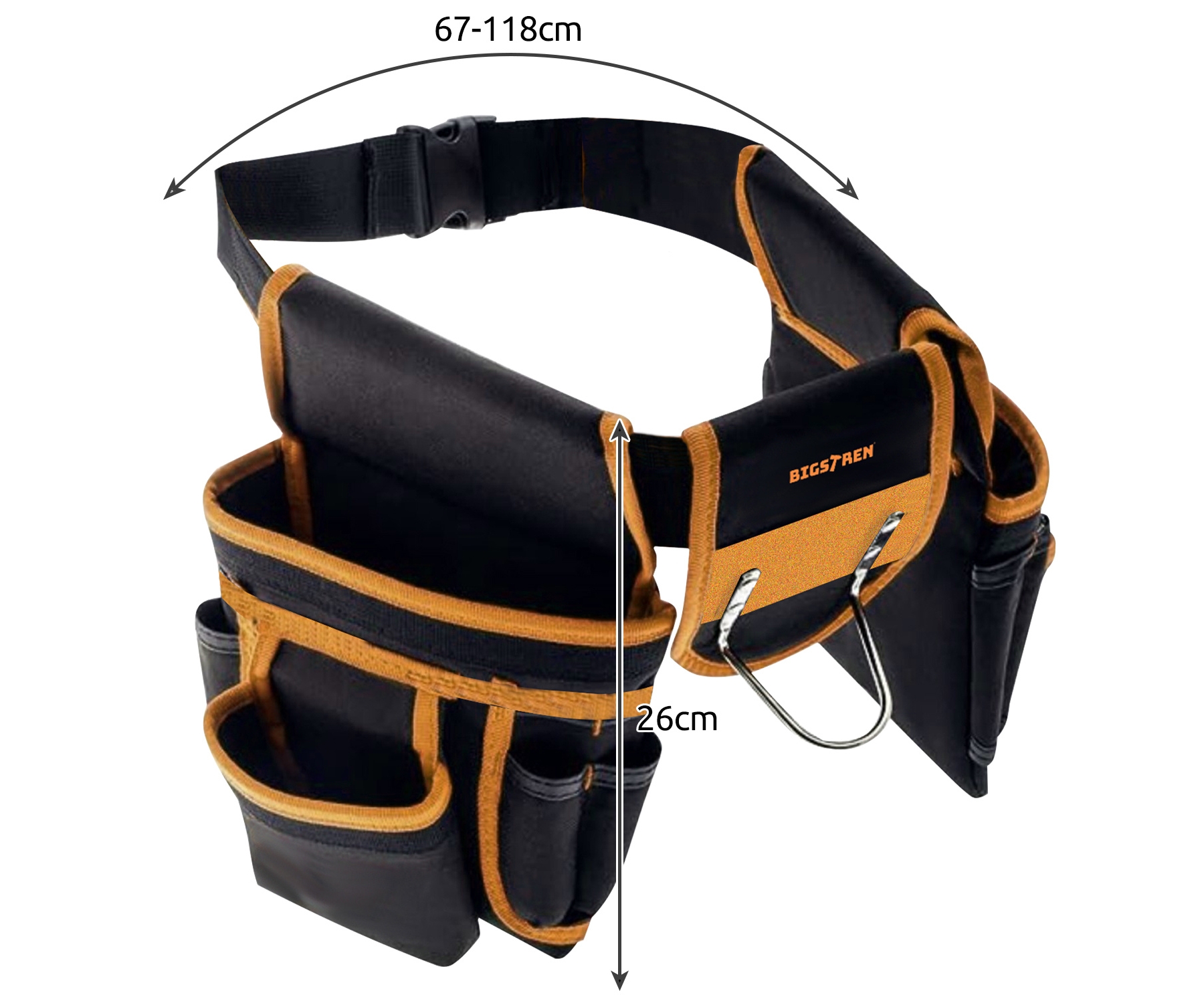 Application: Construction and public works, Renovation works, DIY, Assembly ; Color: Black + Orange ; Main features: 22 pockets, 2 soft handles (loops), 1 hammer holder, 2 sliding bags, Adjustable belt, Comfortable clasp ; Dimensions: 67 ... 118 cm - waist size, 26 cm - pocket length ;