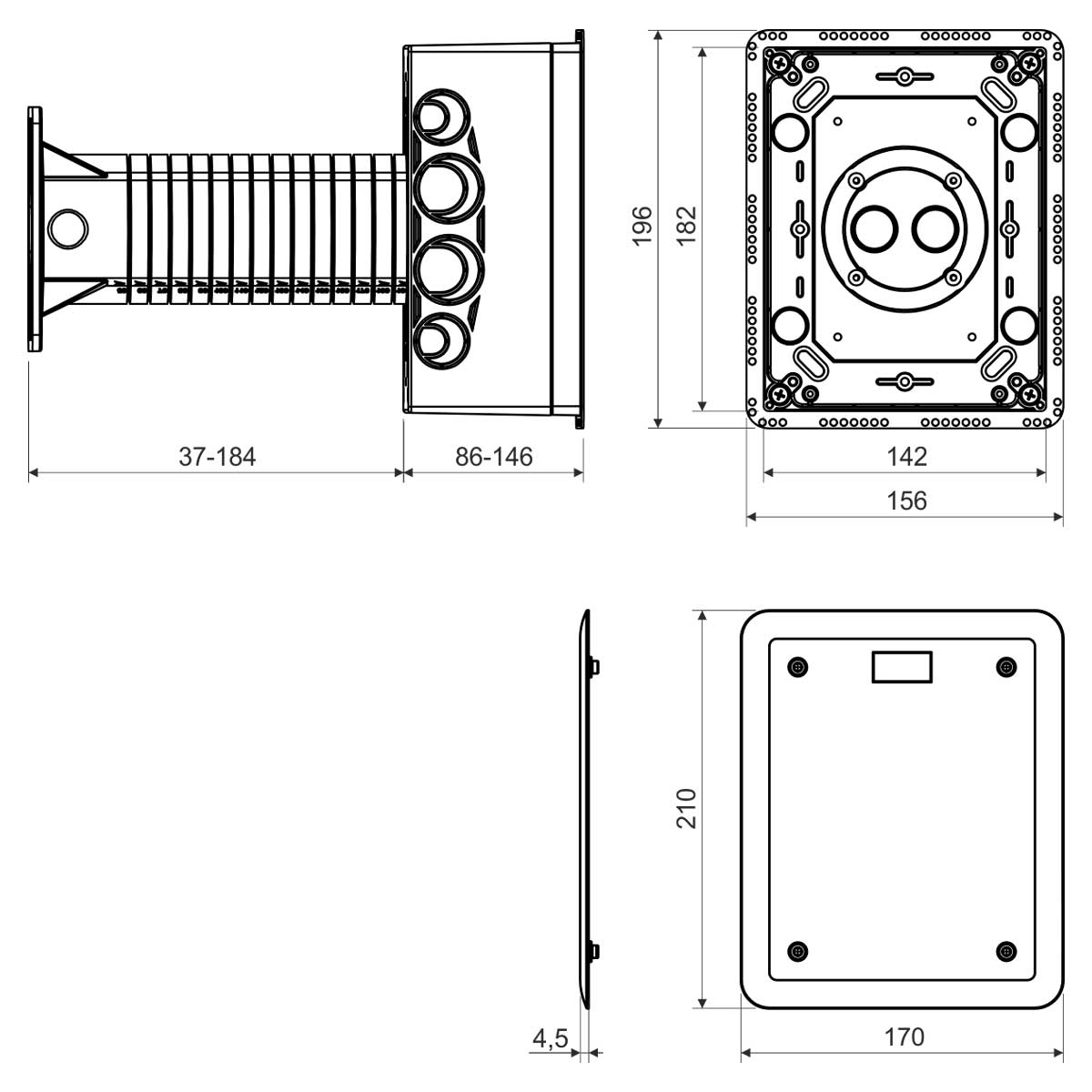 • Expansion plugs, Mounting screws, flat lid, rubber gasket - included