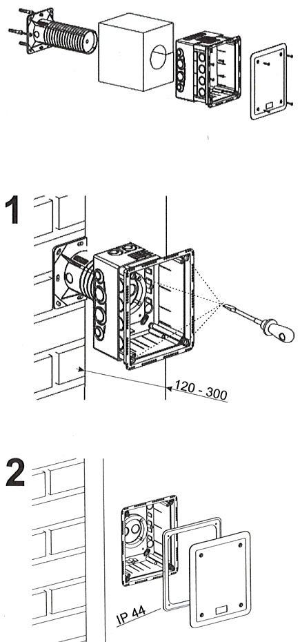 "Index of Protection": IP30 / IP44 ; Voltage insulation: ~ 400 V ; Material: Non-halogen plastic ; Color: Light gray ; Thickness of the insulating layer: 120 ... 330  mm ; Mounting holes distance: 60 mm, 71 mm ; Dimensions: 196 x 156 x 86 ... 146 mm (box), 210 x 170 x 4.5 mm (cover), 120 x 120 x 200 mm (carrier) ;