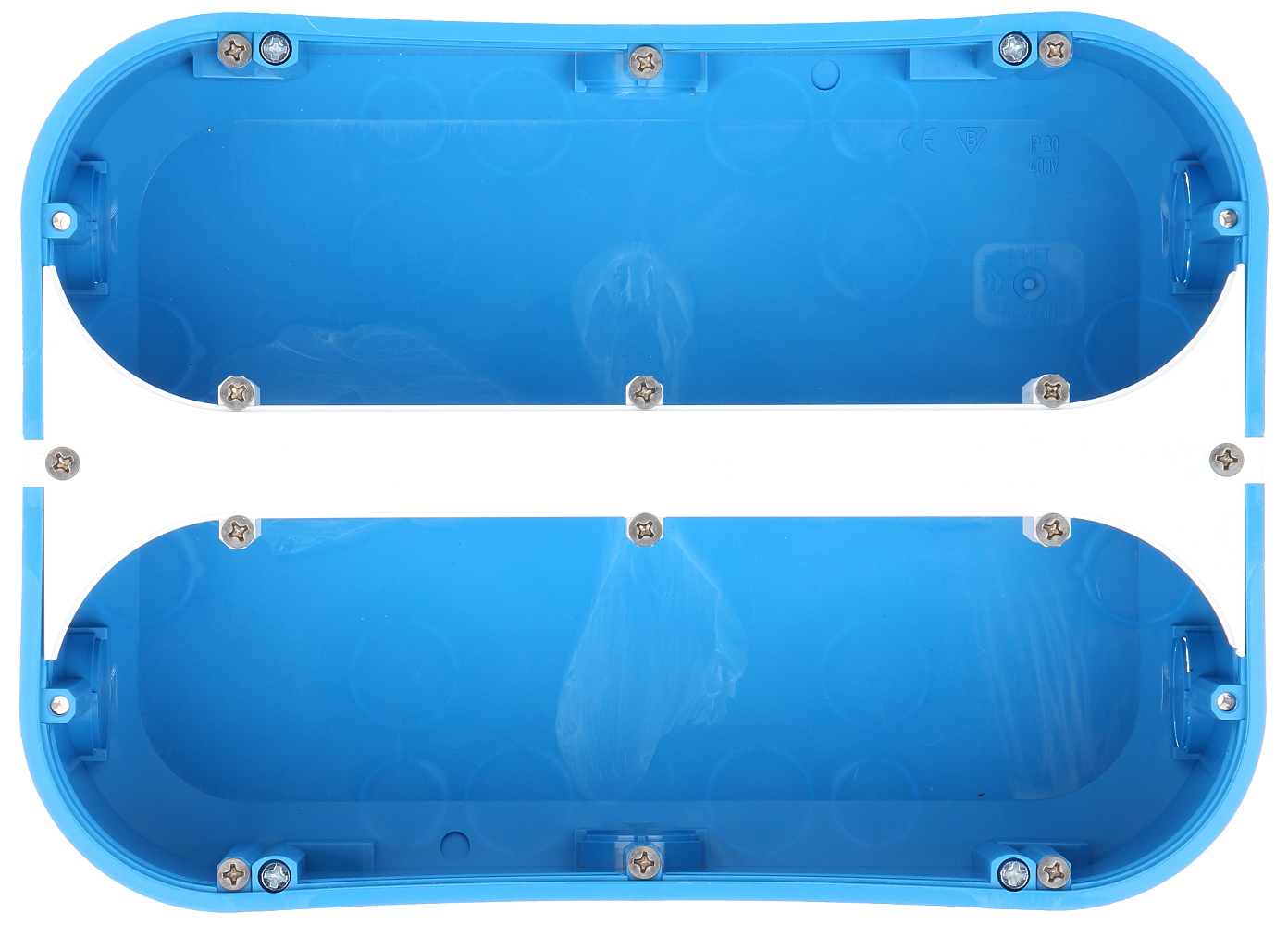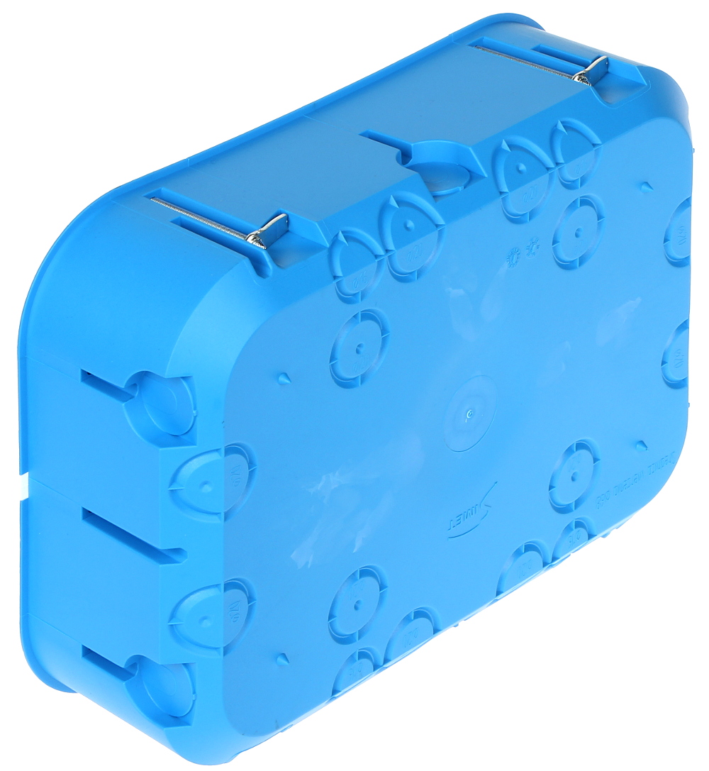 Flush mounting box; "Index of Protection": IP30 ; Main features: for hollow walls ; Material: halogen free and inflammable ; Color: Blue ; Mounting holes distance: 60 mm ; Dimensions: 229 x 171 x 68 mm ;
