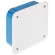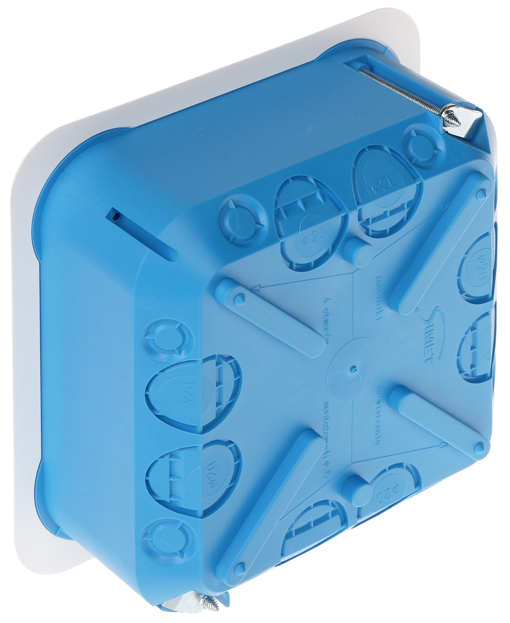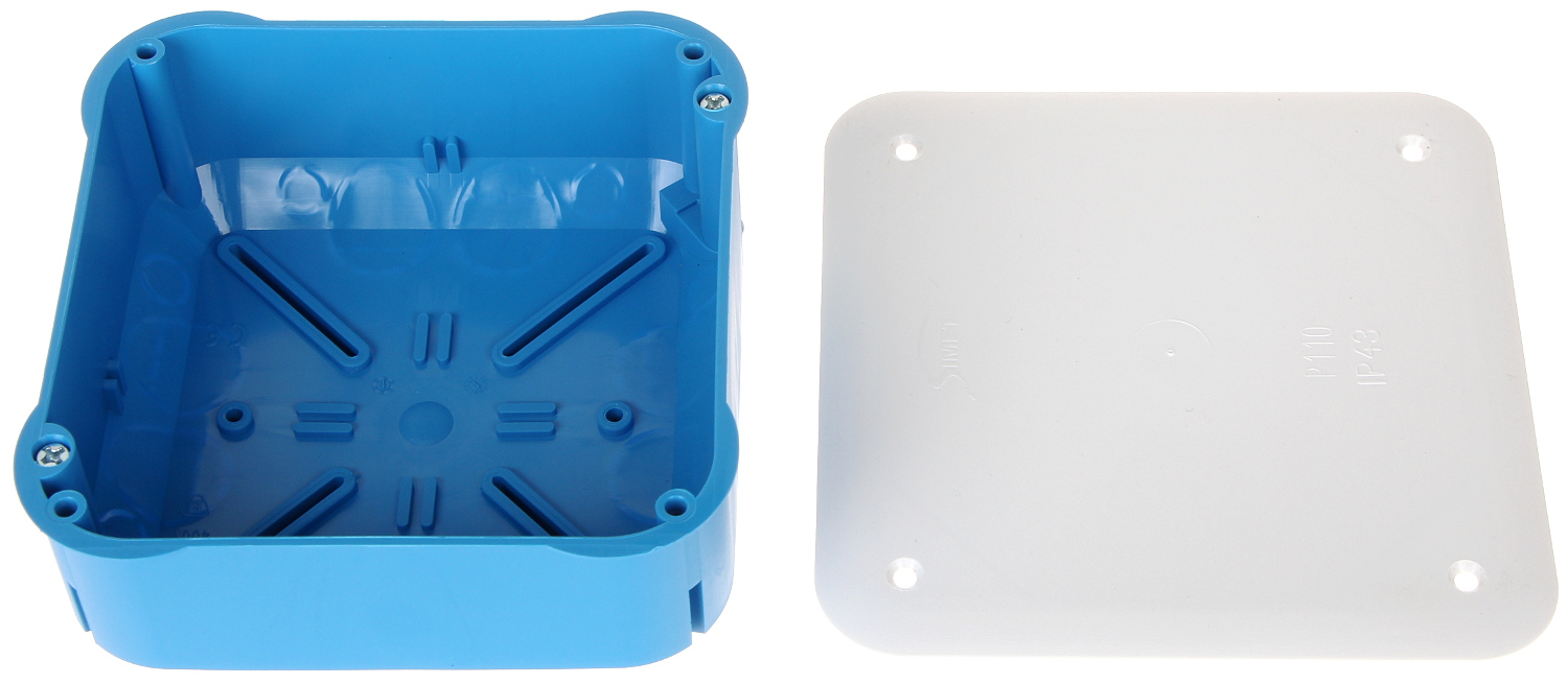 Flush mounting box with cover; "Index of Protection": IP43 ; Main features: for hollow walls, for special purposes ; Material: halogen free and inflammable ; Color: Blue / White ; Mounting holes distance: 90 mm ; Dimensions: 110 x 110 x 48 mm ;