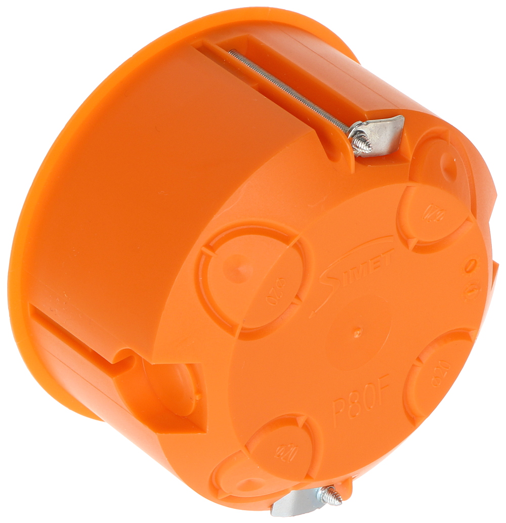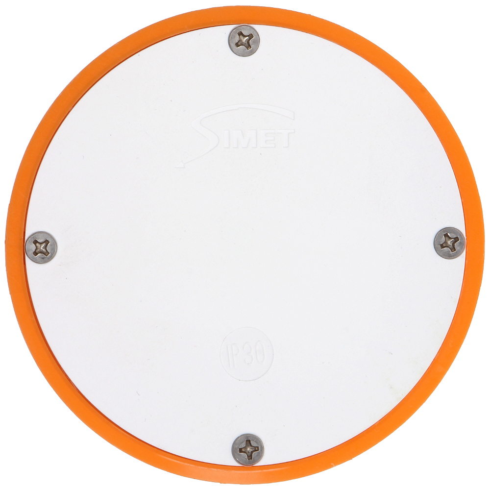 Flush mounting box with cover; "Index of Protection": IP30 ; Main features: for hollow walls ; Material: Plastic ; Color: Orange / White ; Mounting holes distance: 75 mm ; Dimensions: Ø 87 x 50 mm ;