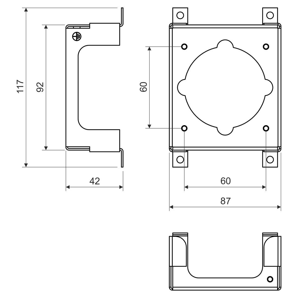 Material: Steel - surface finishing ZnCr ; Color: Silver ; Mounting holes distance: 60 mm ; Dimensions: 117 x 87 x 42 mm ;