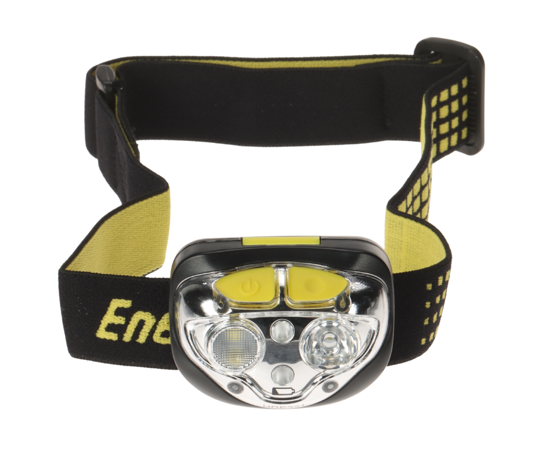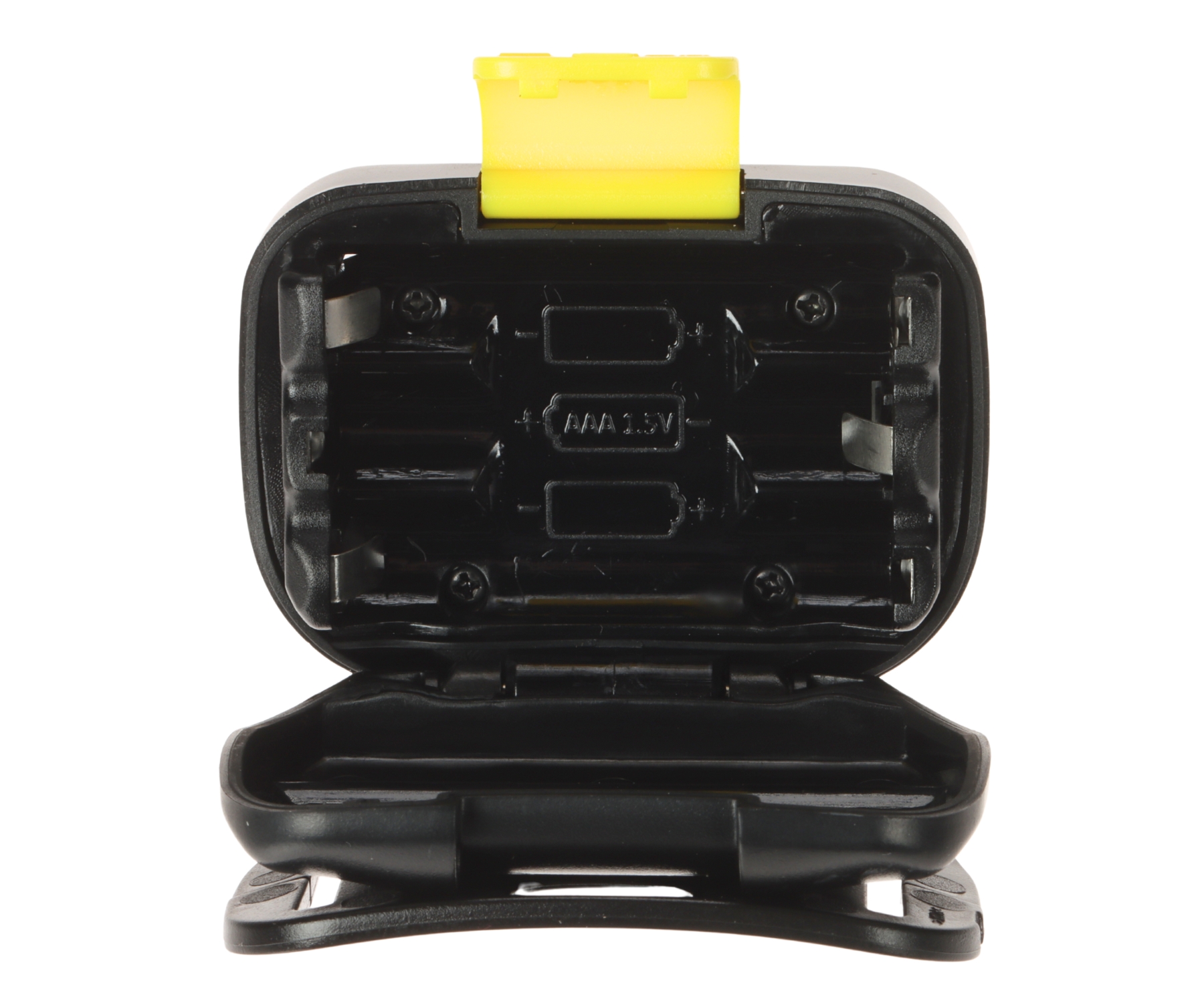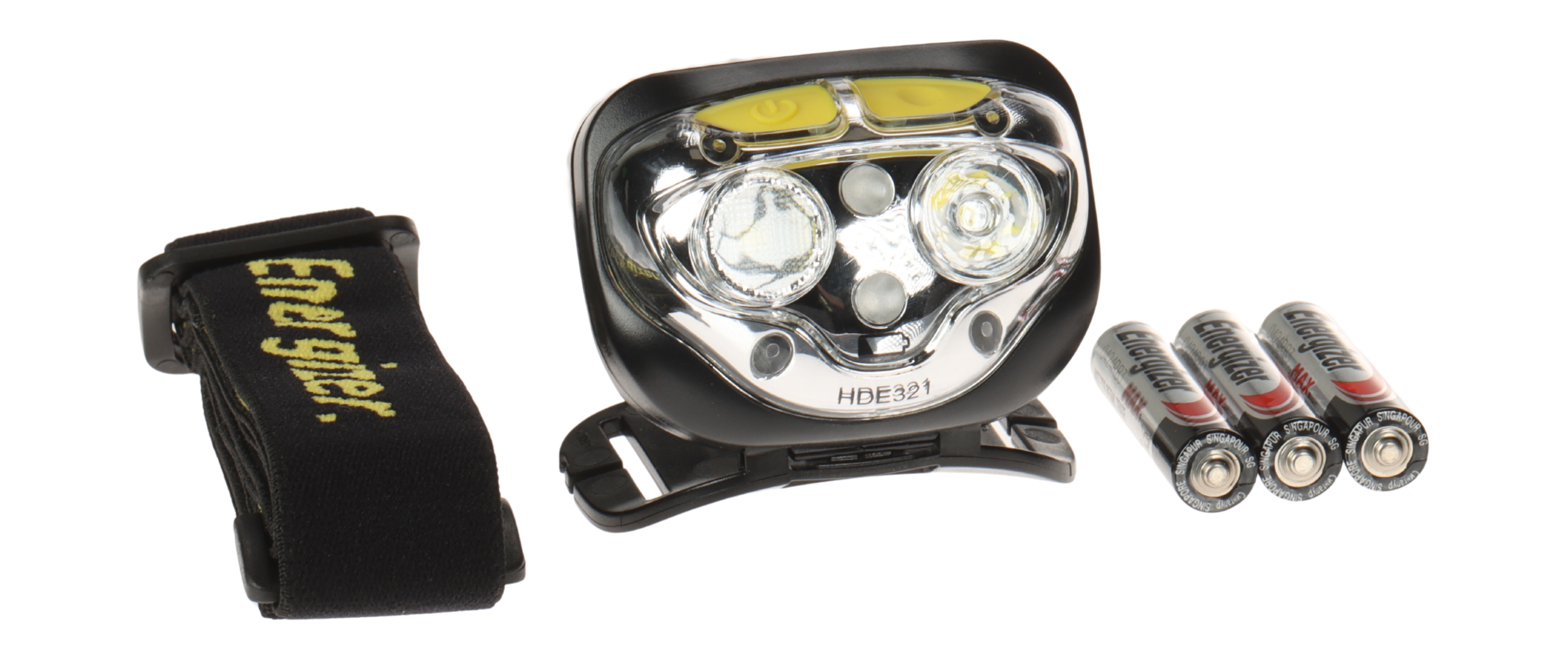 Light source: 2 pcs LED - White + 1 pcs LED - Red + 1 pcs LED - Green ; Luminous flux: max. 450 lm (high), min. 30 lm (low) ; Battery power supply: Alkaline batteries : 3 pcs LR03 AAA ; Main features: Tilt adjustment, Backup time : 2.75 h (high) ... 50 h (low), 7 light modes , Fluent luminosity control (Smart Dimming), Shatterproof lens, "Index of Protection" : IPX4 ;