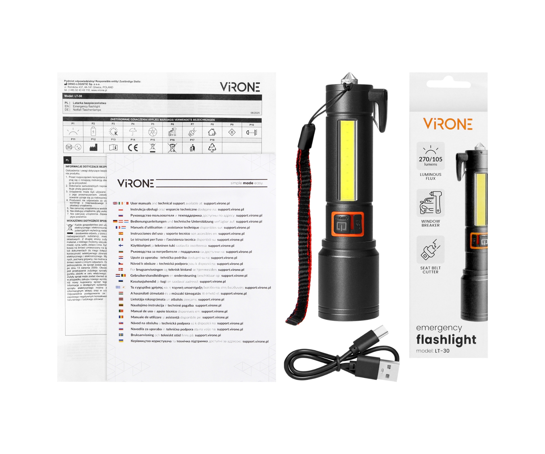 Light source: LED ; Luminous flux: max. 270 lm, min. 105 lm ; Battery power supply: Alkaline batteries : 4 pcs AA ; Main features: Impact resistant up to 7 m, 2 light modes , Fluent luminosity control ;