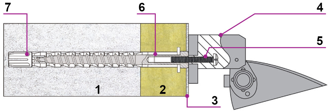 Wall screw with internal thread allows mounting of heavy elements on the facade of buildings insulated with Styrofoam (eg. the cameras, lights, etc.);